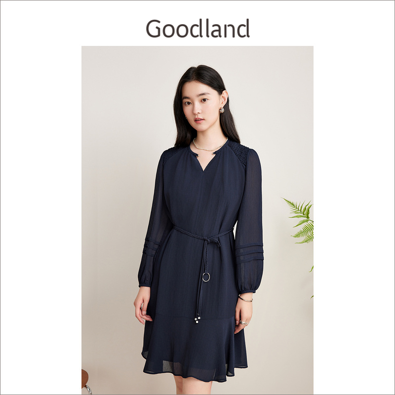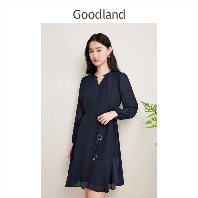 Goodland美地2024年秋季新款轻盈雪纺小v领气质法式连衣裙女短款
