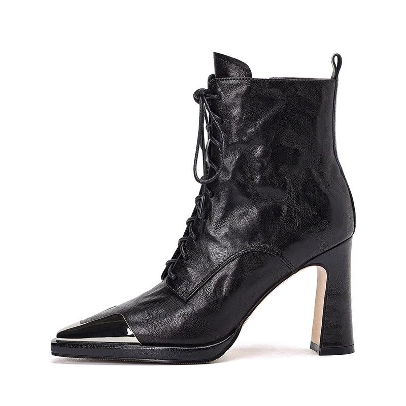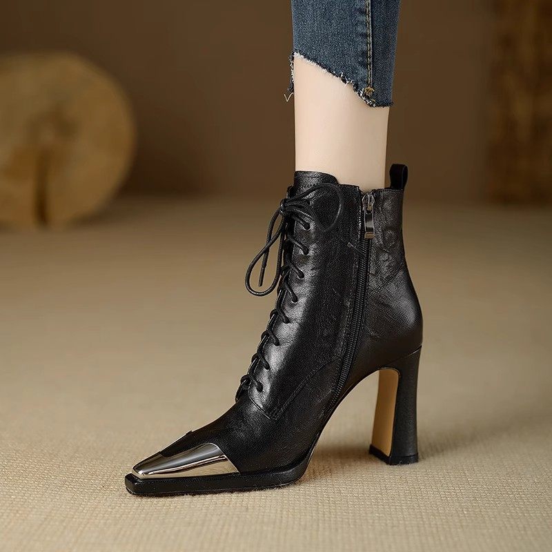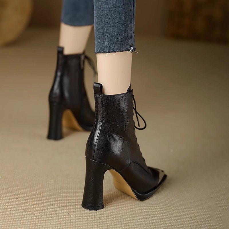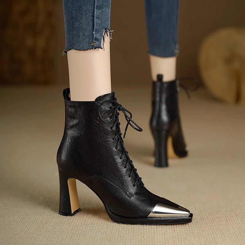 金属尖头短靴女2025年秋季新款真皮马丁靴气质高跟时装靴粗跟短靴