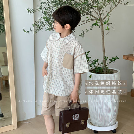 虾酱麻麻男童格子衬衫套装夏季薄款2025新款中大童短袖儿童两件套