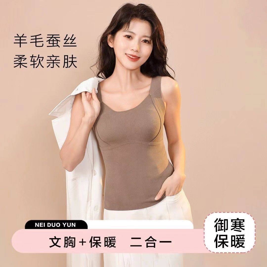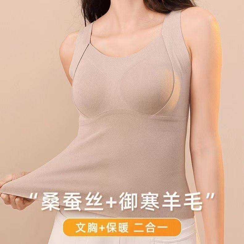 秋冬羊绒蚕丝保暖内衣女加绒加厚自发热背心带胸垫一体文胸无钢圈