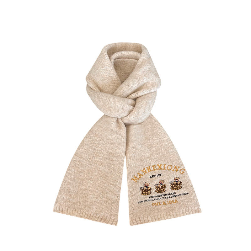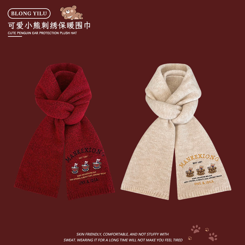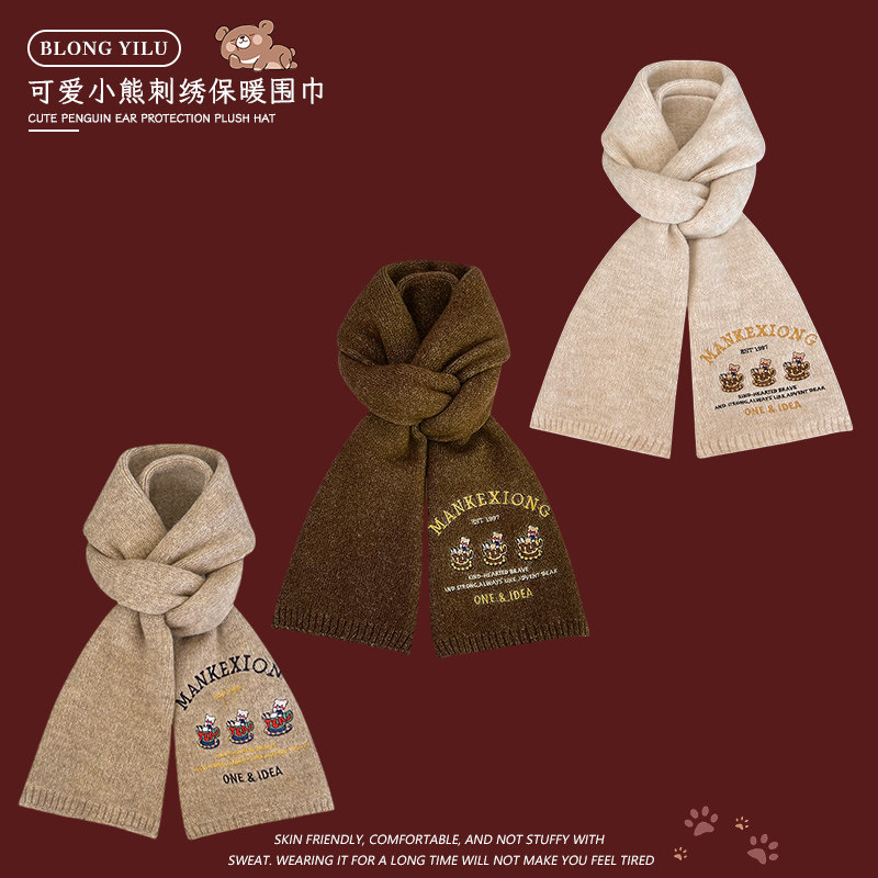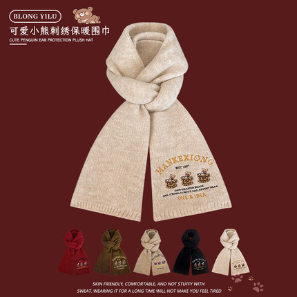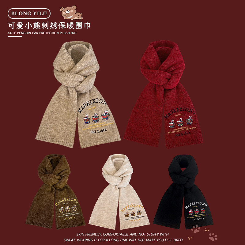 日系可爱小熊刺绣针织围巾女款2025冬季新款学生情侣氛围感围脖潮