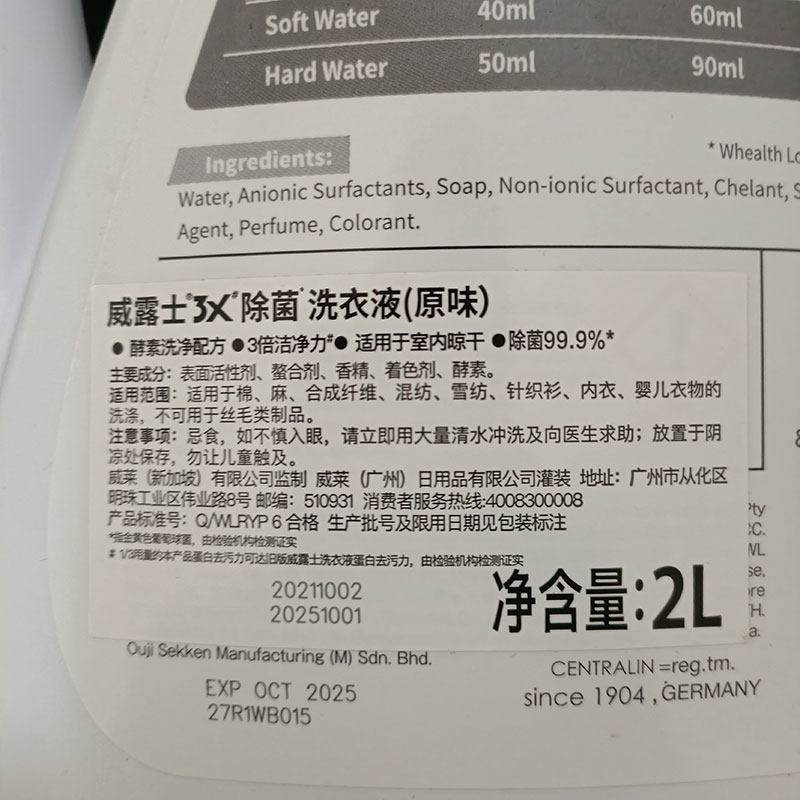新品威露士3X洗衣液原味2L除菌酵素机洗手洗内衣洗
