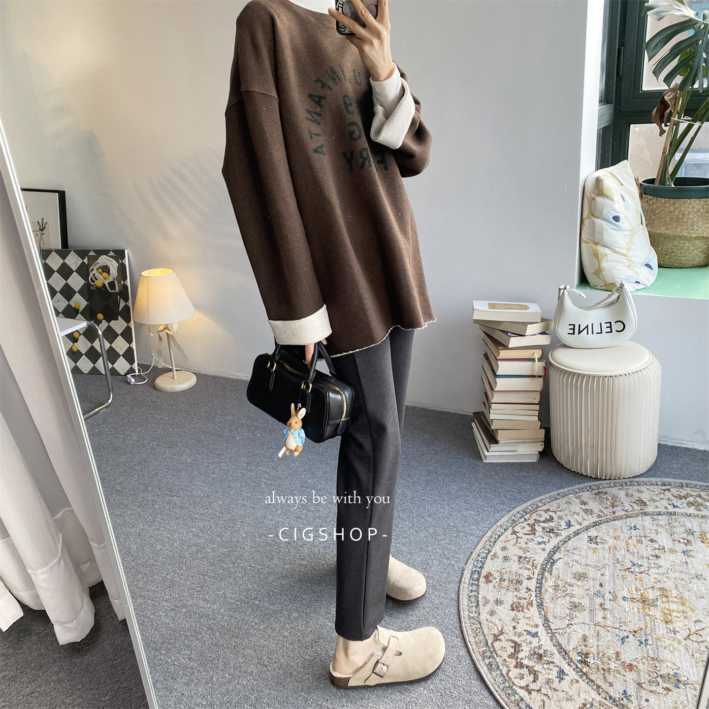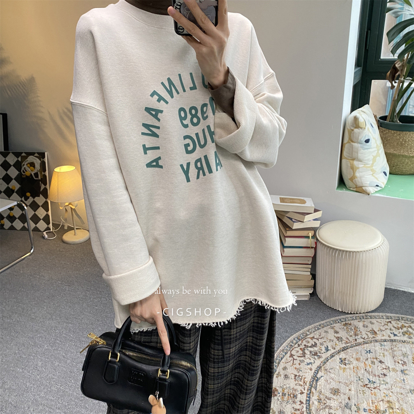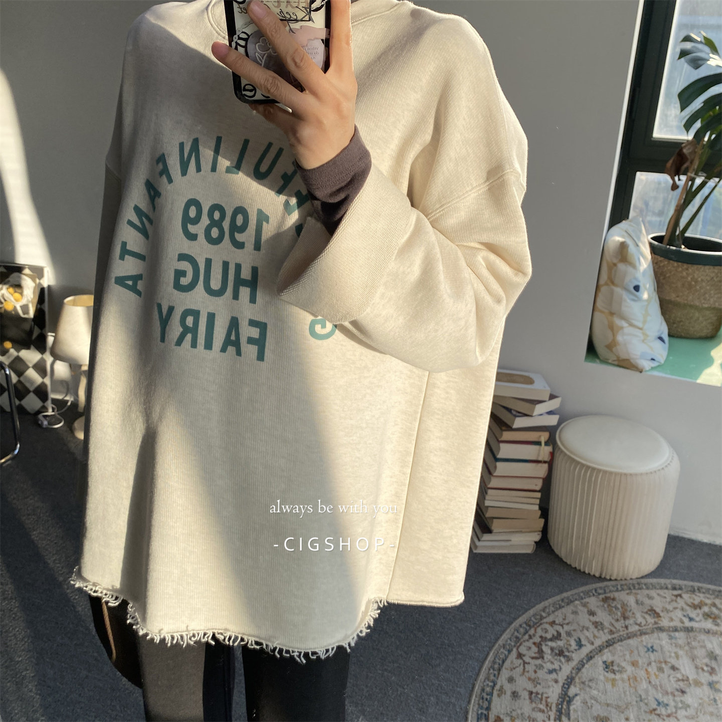 韩国单宽松版毛须边圈圈棉植绒字母印花圆领卫衣藏肉显瘦大版型