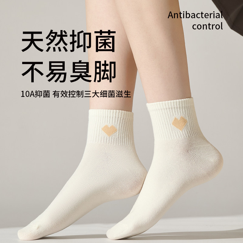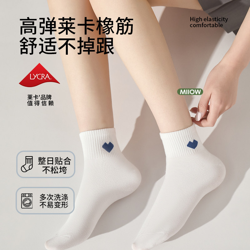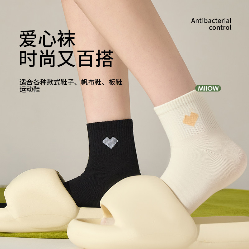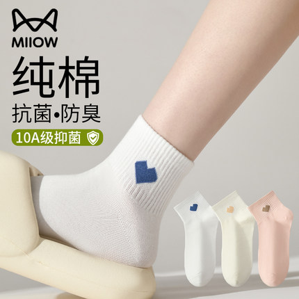猫人白色纯棉袜子女秋冬季中短筒抑菌防臭透气薄款刺绣爱心短袜