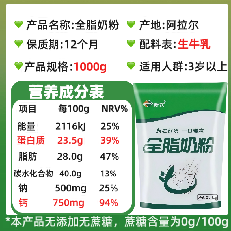 新疆新农纯奶粉生牛乳成人中老年官方正品营养袋装1kg袋装