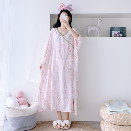 开衩新中式短袖加长大码棉绸睡裙宽松孕产妇胖MM200斤国风家居裙