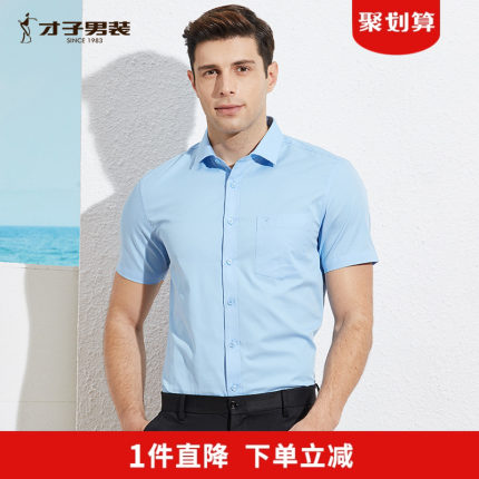才子奥莱清仓短袖衬衫男夏季修身透气纯色商务正装上班职业白衬衣