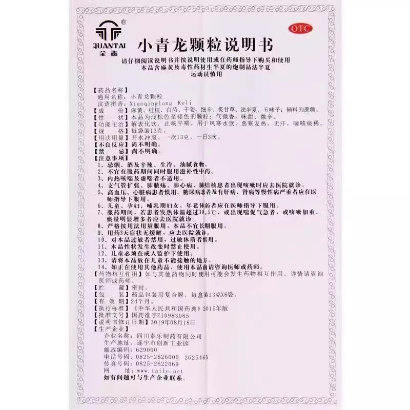 【全泰】小青龙颗粒13g*6袋/盒发热咳嗽风寒感冒风寒鼻炎