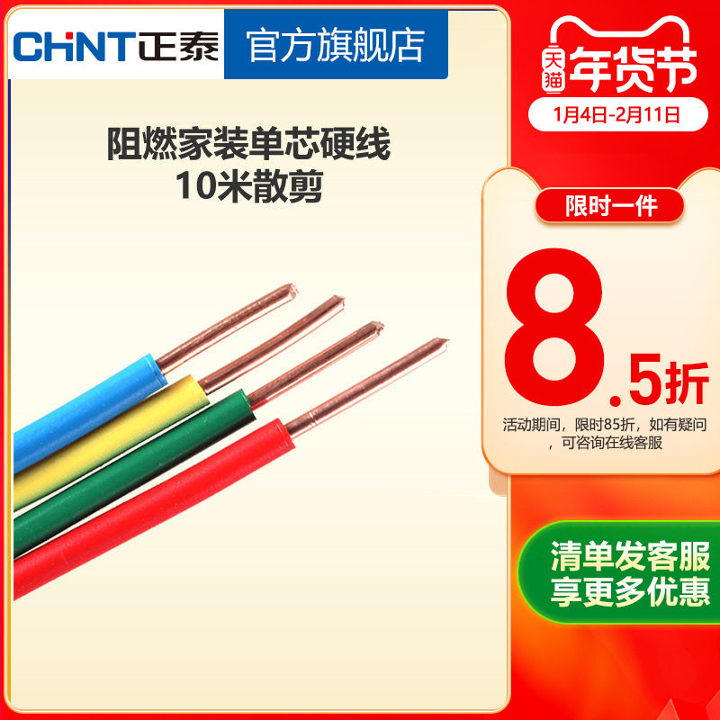 正泰电线阻燃硬线10米散剪 国标BV1.5 2.5 4平方铜芯家用家装电缆