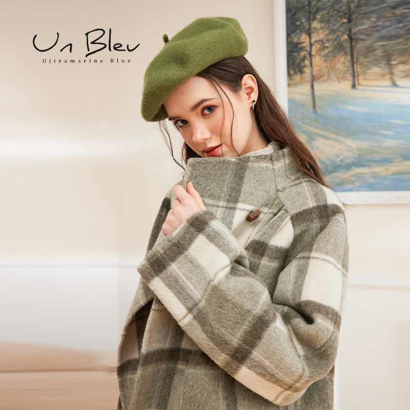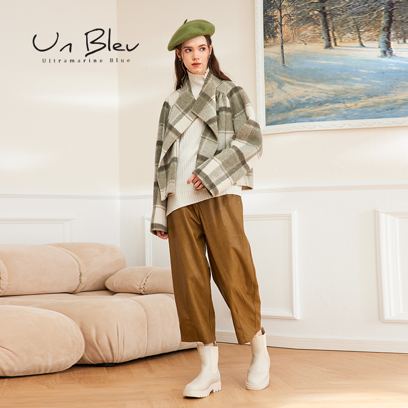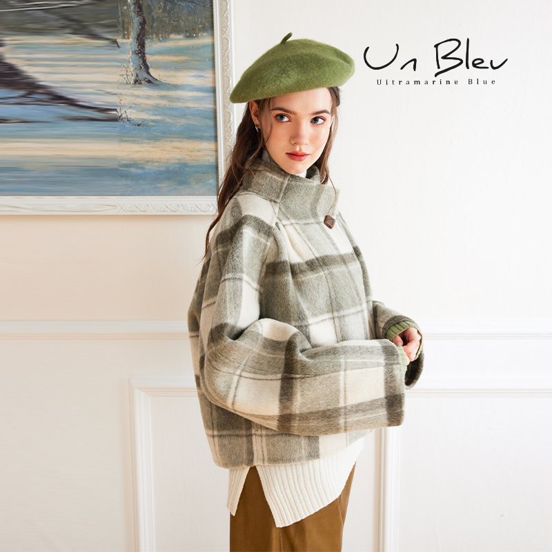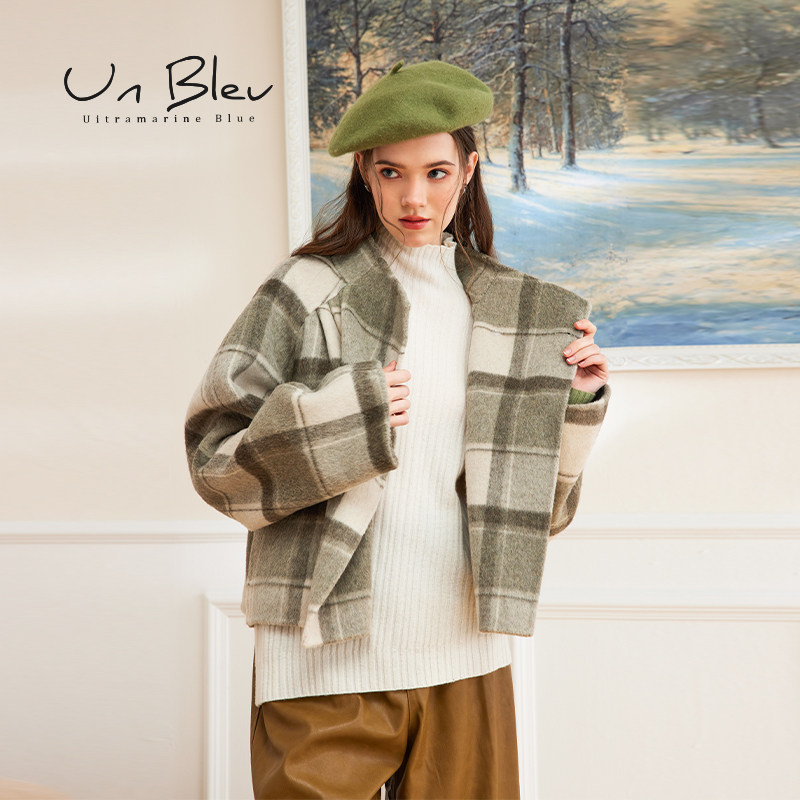 格子毛呢外套女秋冬新款法式复古女装绿色短款立领双面呢大衣
