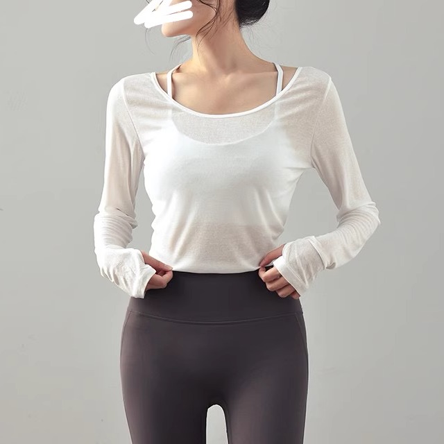 瑜伽服上衣女美背绑带运动长袖跑步训练速干健身服罩衫防晒薄网纱