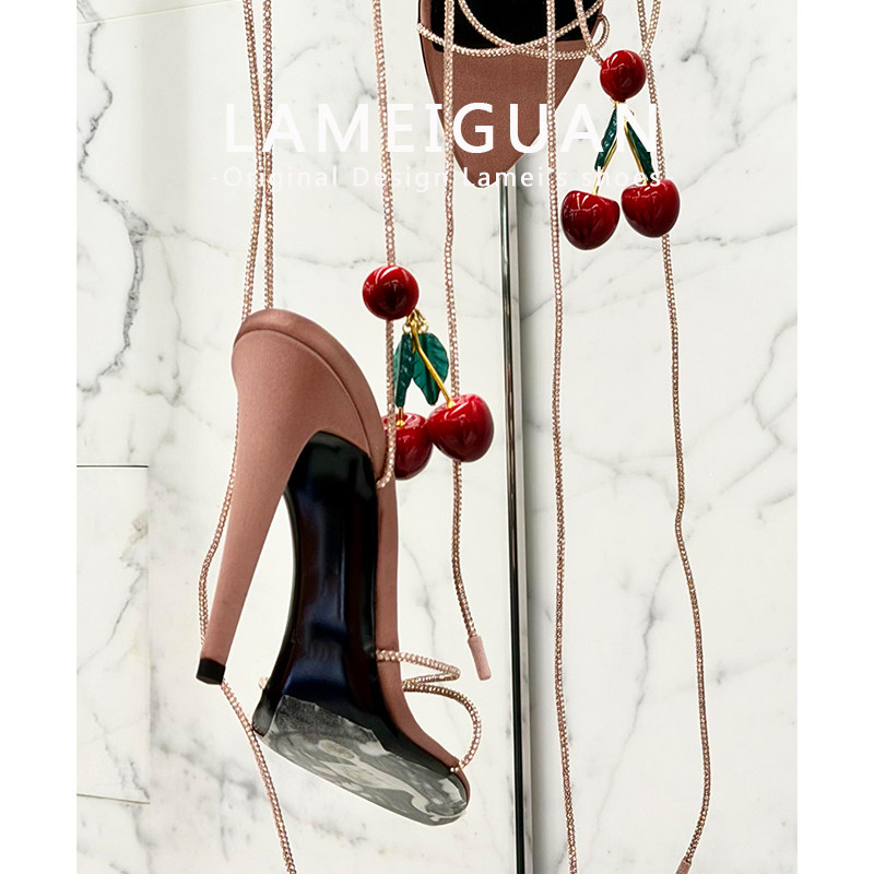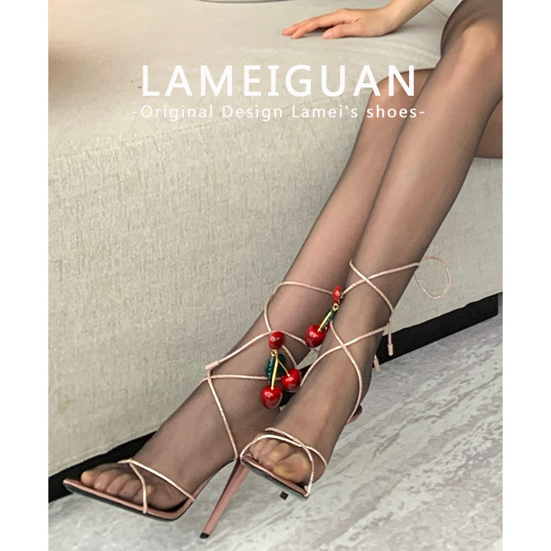 优雅性感粉色樱桃绑带细跟凉鞋女
