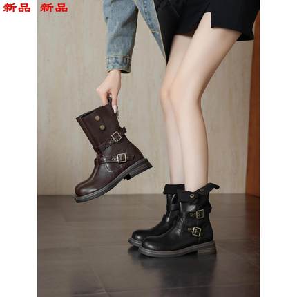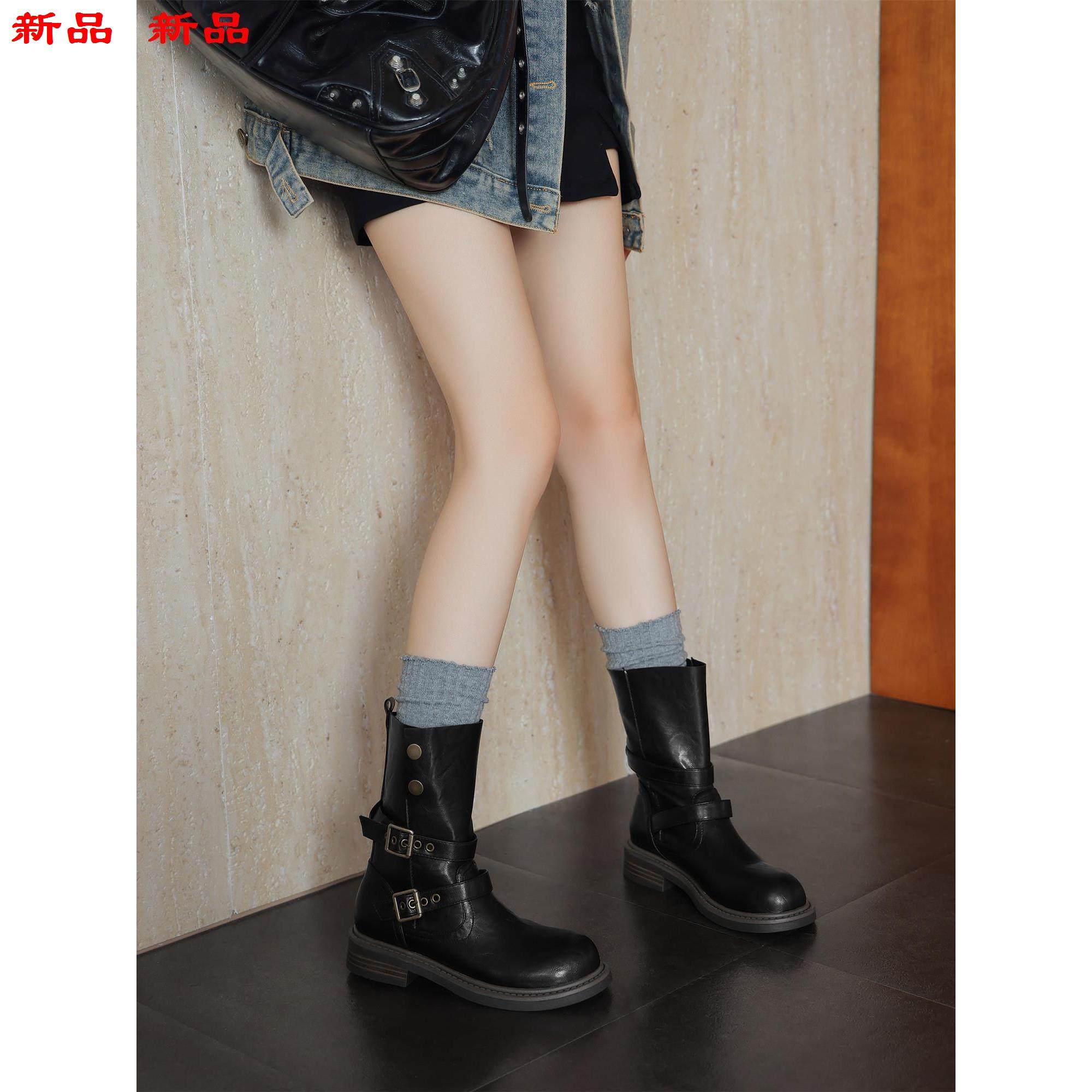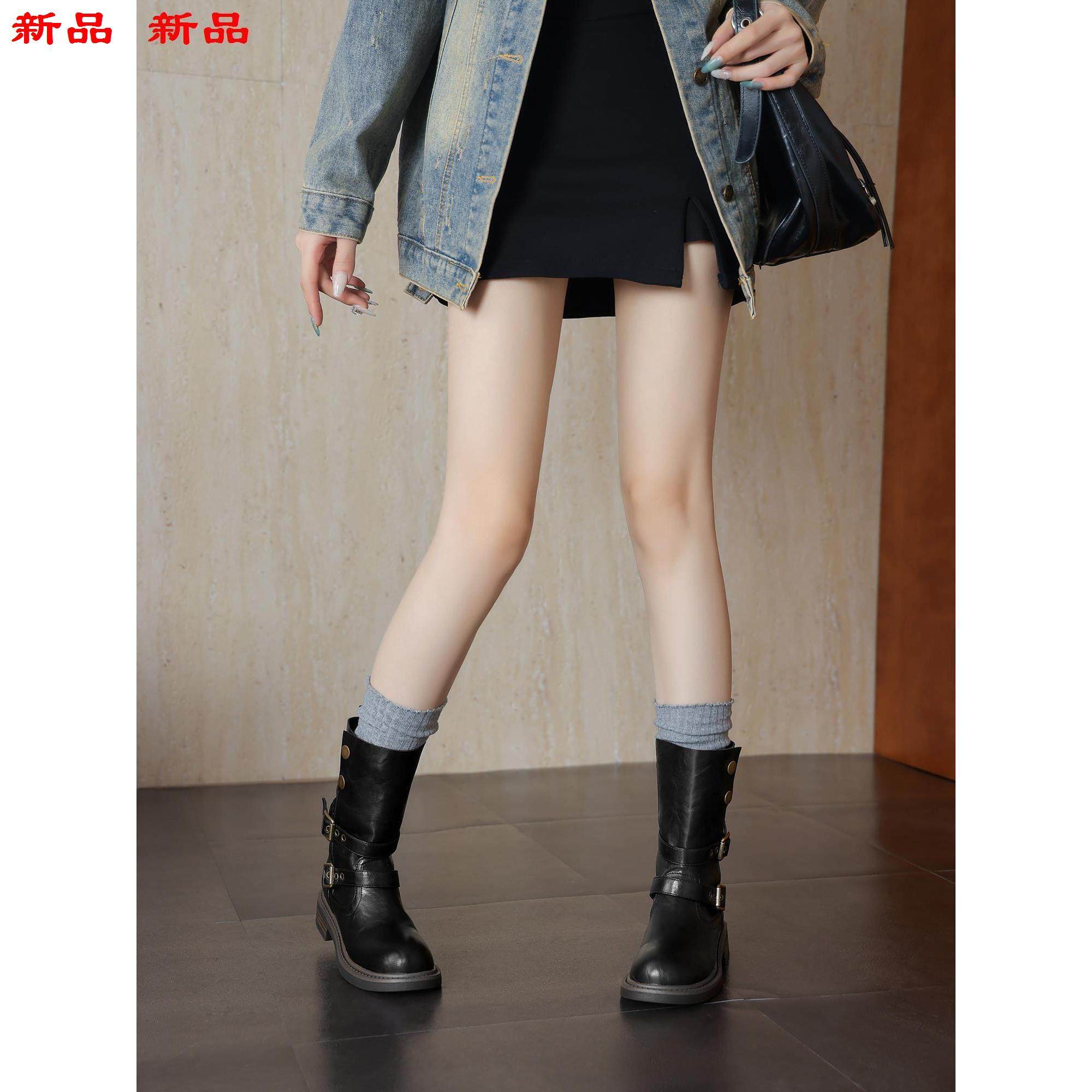 中大码超软靴子41秋冬帅气43女-皮带扣粗跟短靴两穿骑士