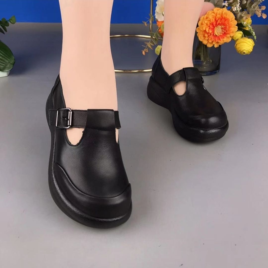 2025春季新款真皮厚底圆头坡跟单鞋女中老年防滑透气复古风妈妈鞋