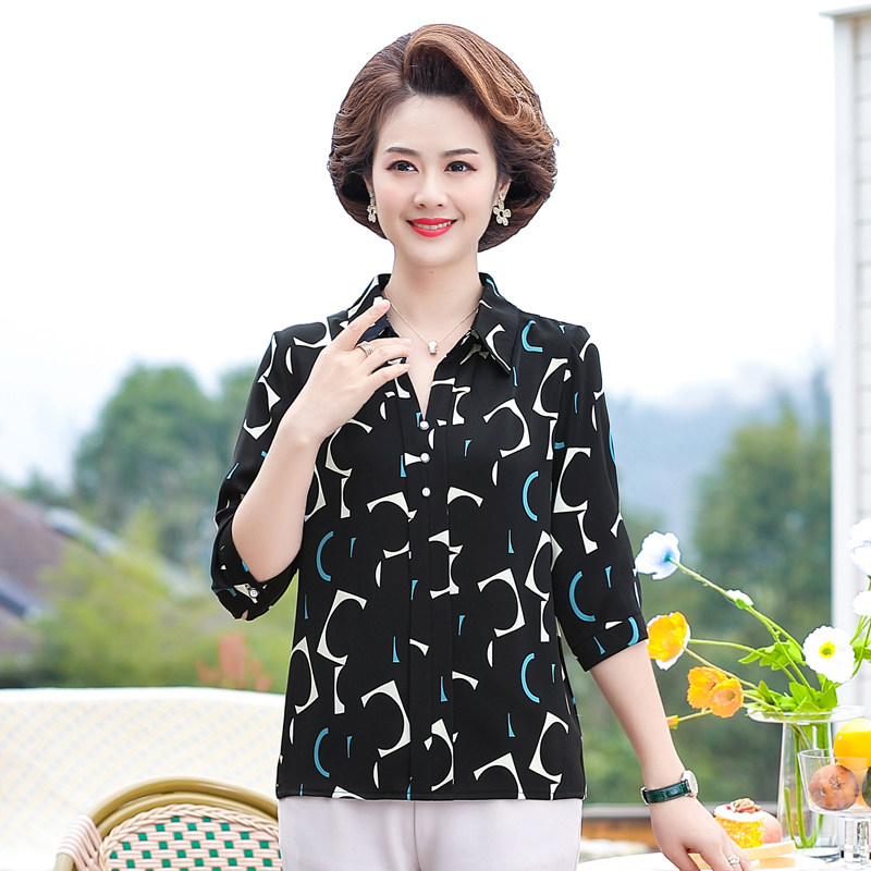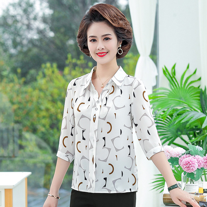 妈妈夏装时尚洋气雪纺衫中老年女装短袖翻领T恤40岁宽松遮肚衬衫