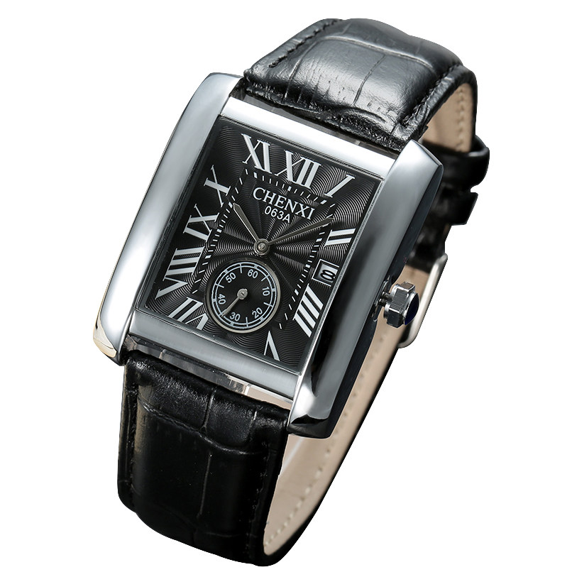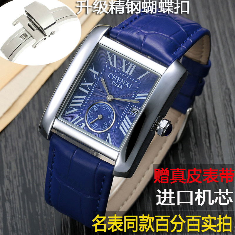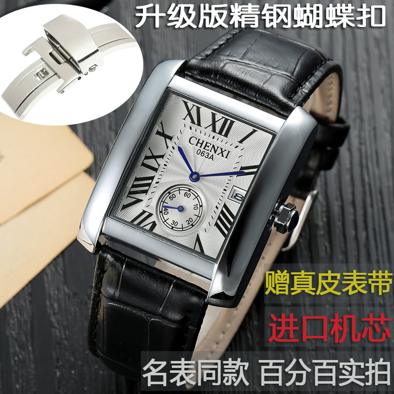 个性男士手表石英表真皮带长方形表盘男表防水学生军表男非机械表