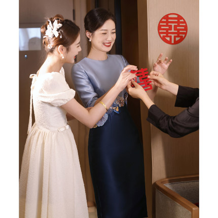 蓝色喜婆婆婚宴装2025新款高贵年轻高端洋气妈妈婚礼礼服平时可穿