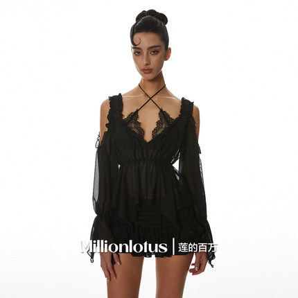 莲的百万黑色性感清透夏天罩衫荷叶蛋糕裙绑带温文胸小短裙两件套