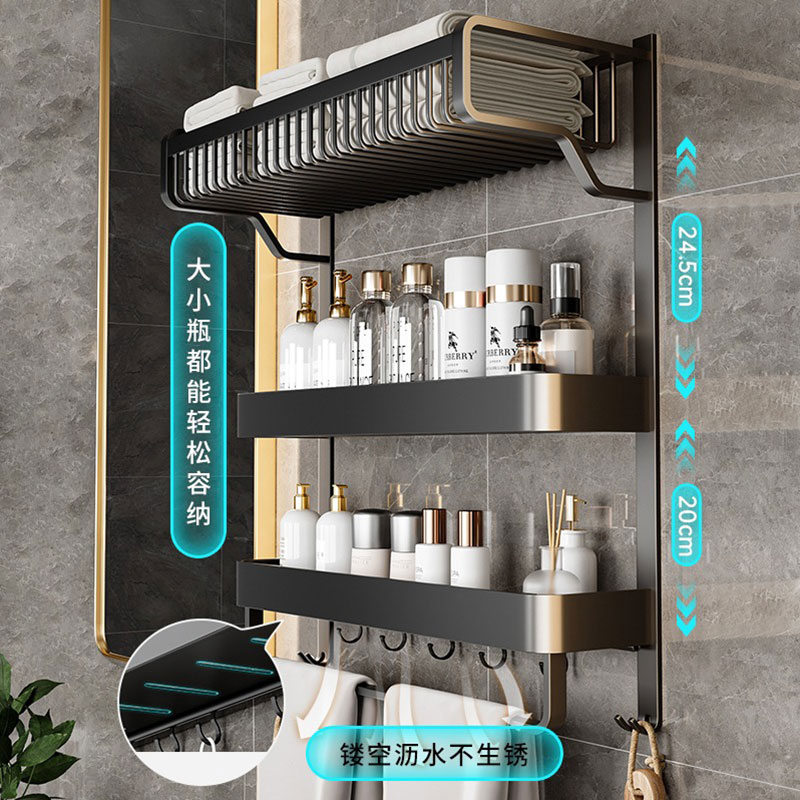 毛巾架卫生间置物架一体免打孔壁挂浴室厕所太空铝浴巾架三层枪灰