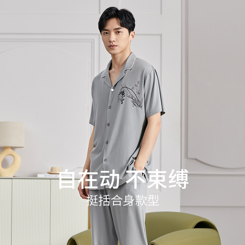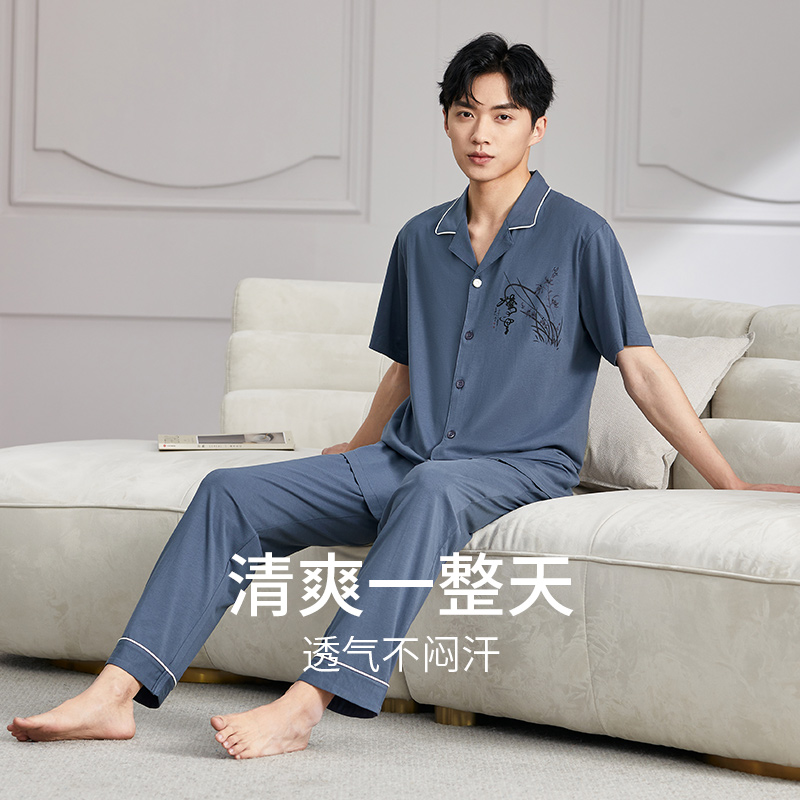 秋鹿旗下【梦伴】睡衣男士夏季棉质短袖长裤夏款夏天薄款大码套装