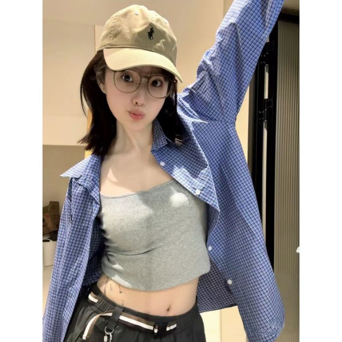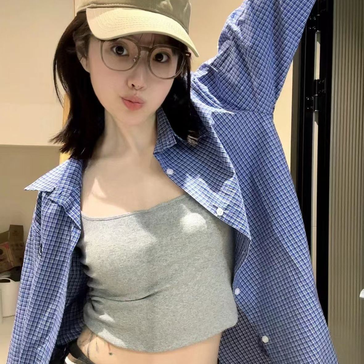 韩系蓝色格子衬衫外套女早秋穿搭2025新款学院风宽松叠穿打底上衣