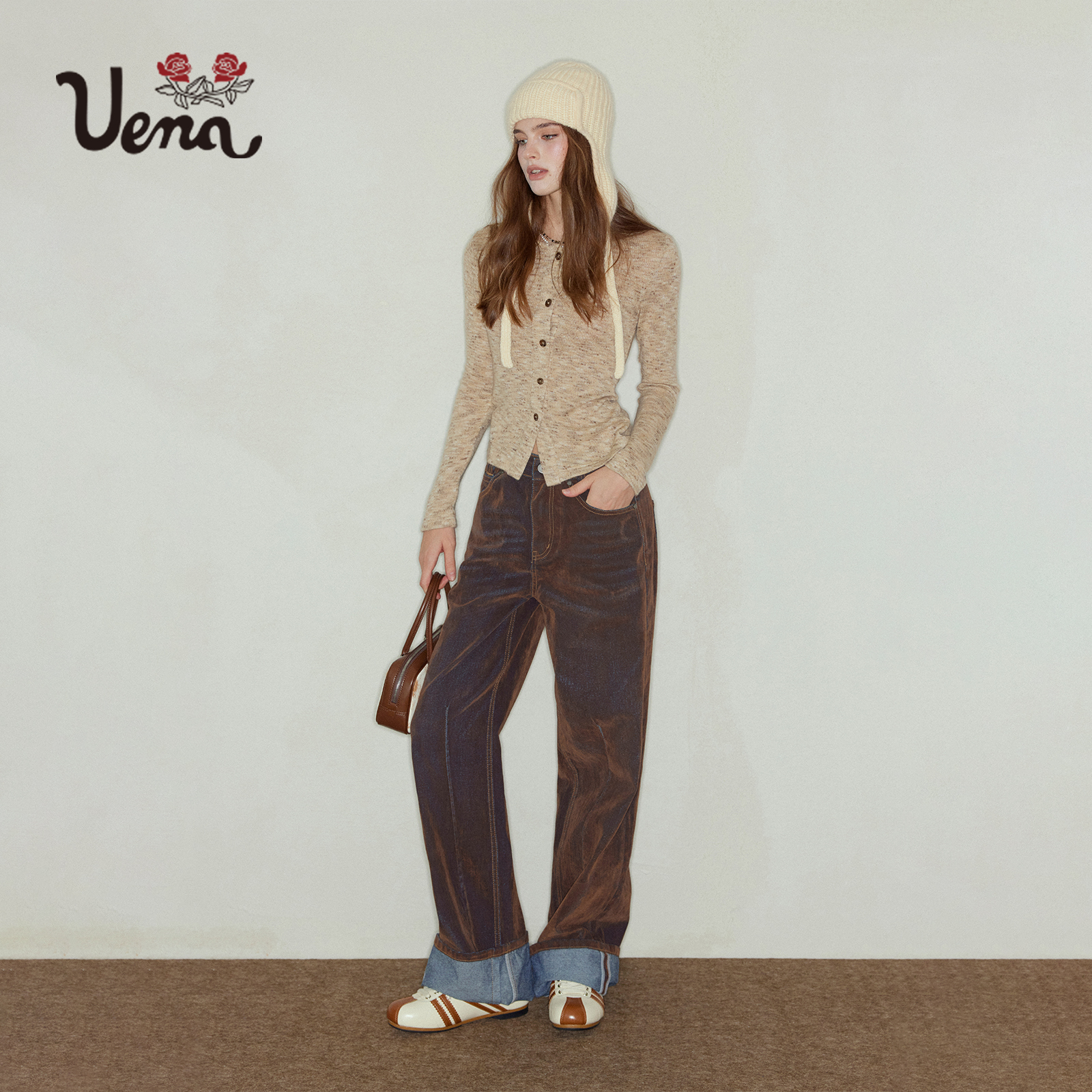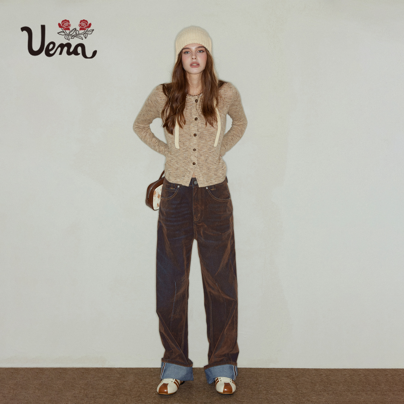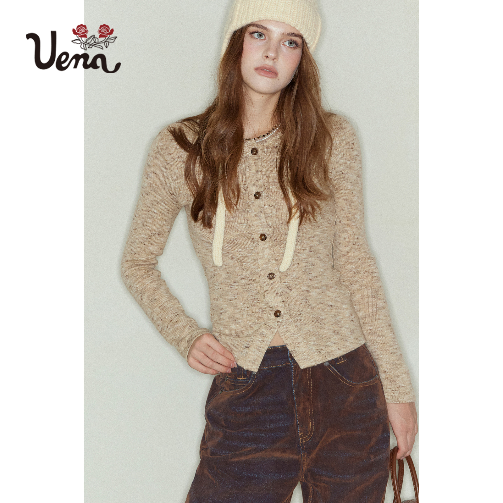 【月下冬青】Uena美式复古驼色花纱圆领针织开衫正肩修身长袖T恤