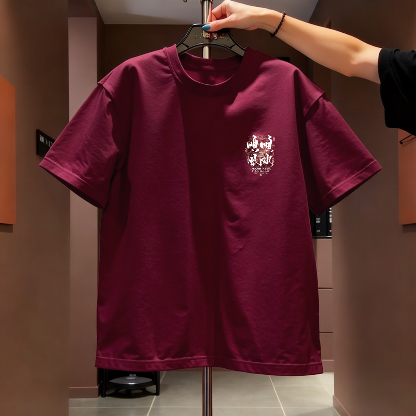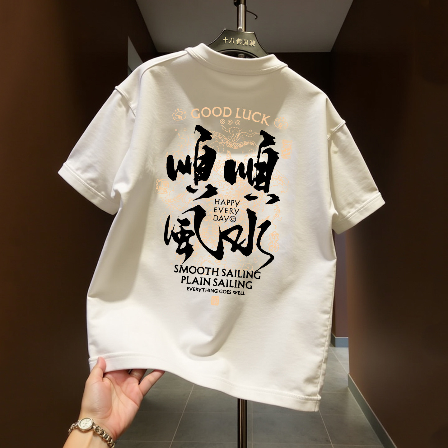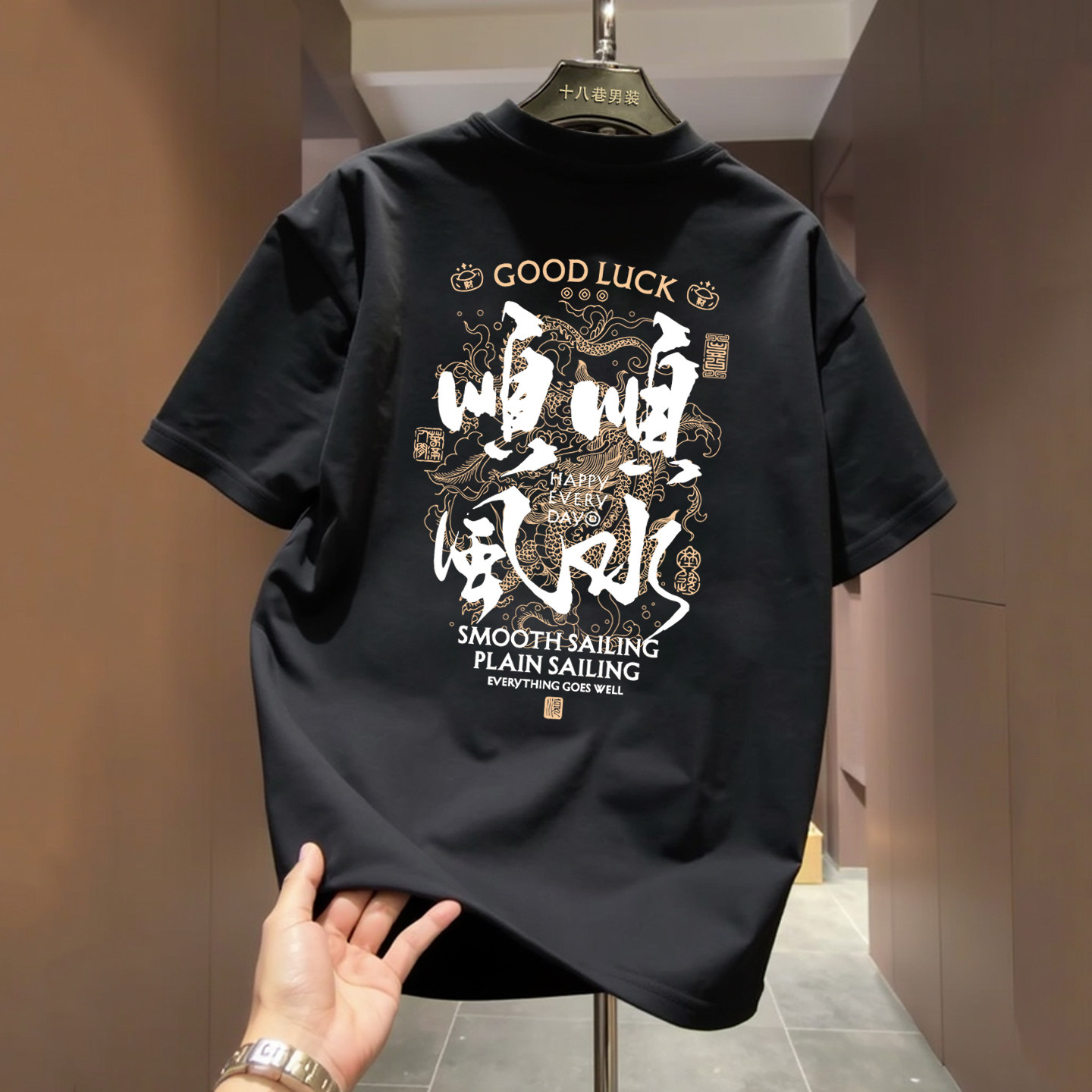 国潮牌风本命年短袖T恤男圆领新款顺风顺水重磅纯棉红色宽松上衣