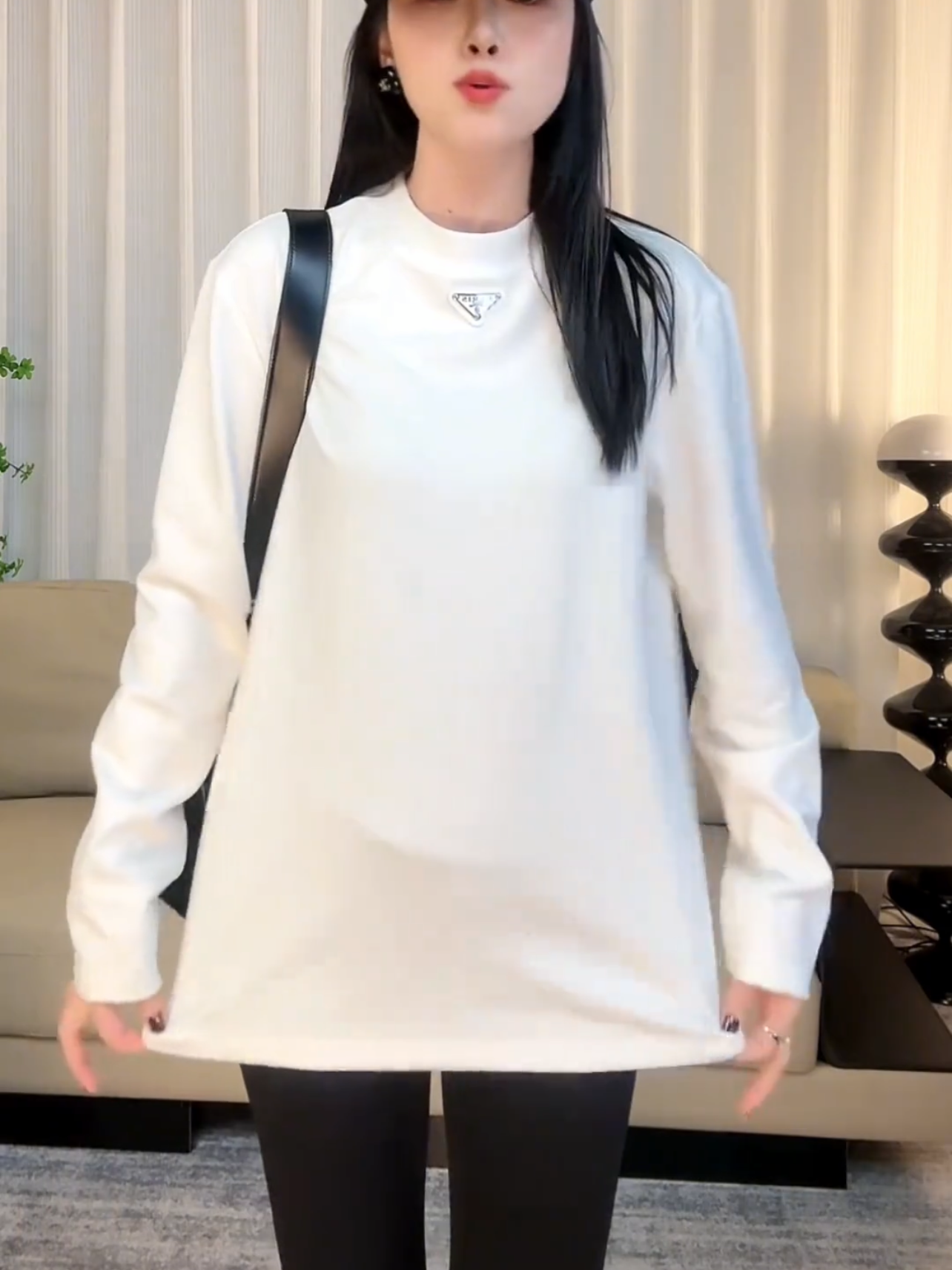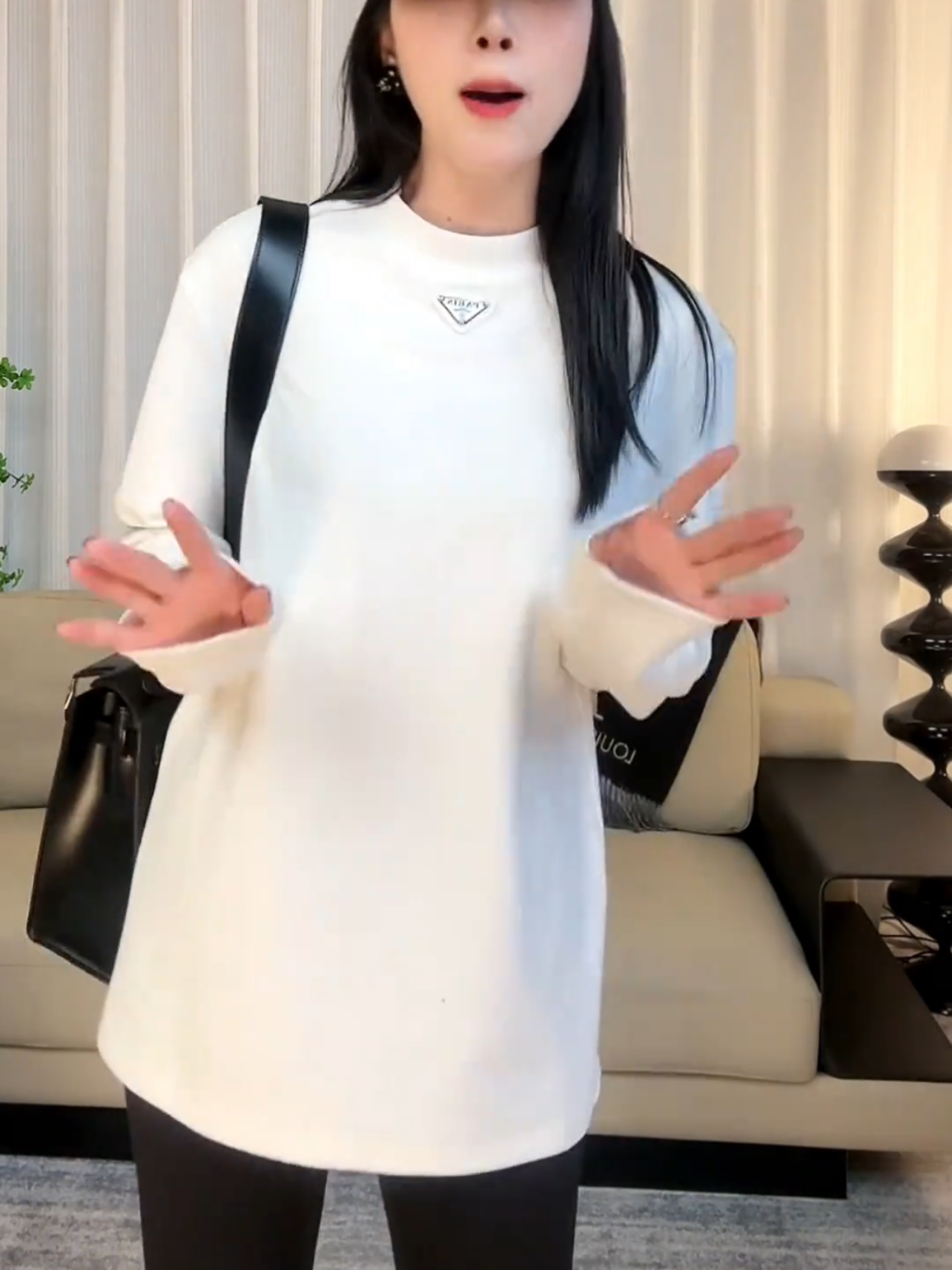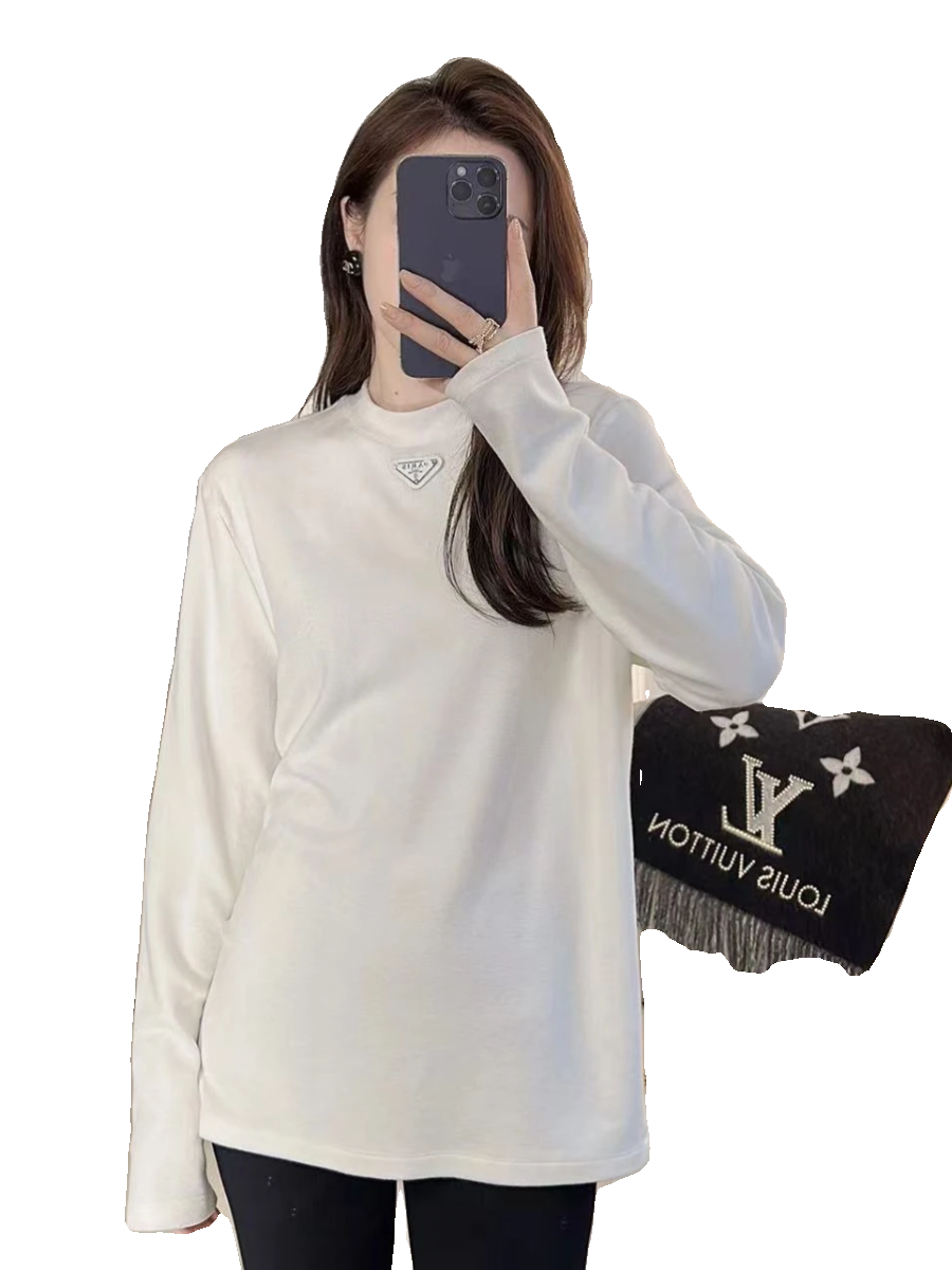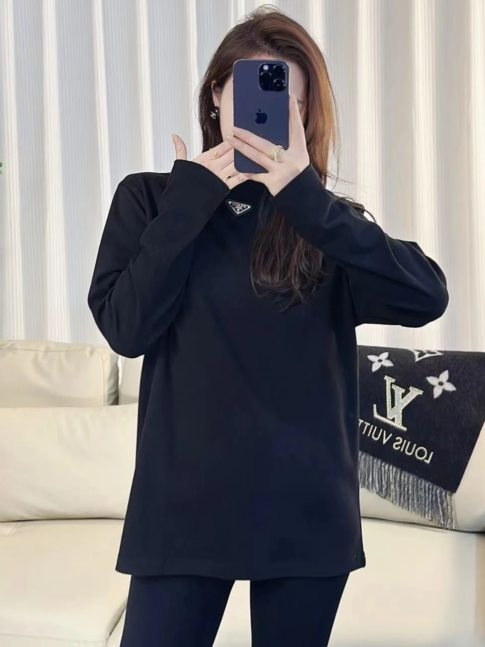 加厚纯棉打底衫女2023秋冬新款百搭设计感三角标中长款长袖T恤女
