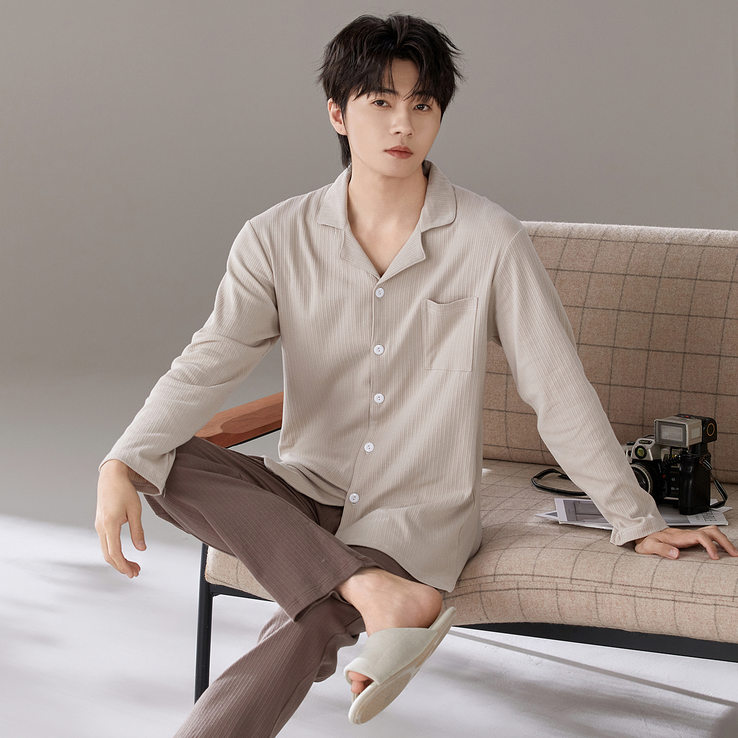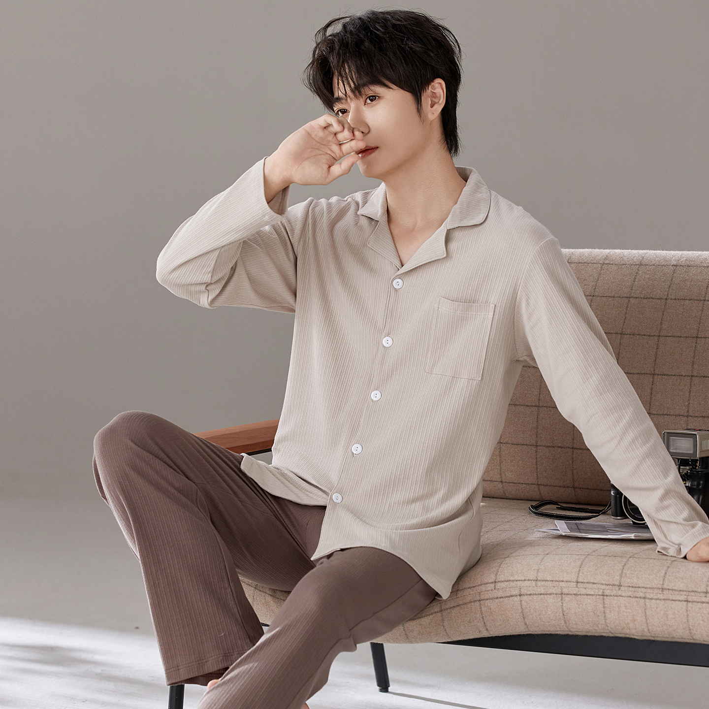 2025新款睡衣男士春秋季纯棉长袖纯色条纹简约休闲宽松秋冬家居服