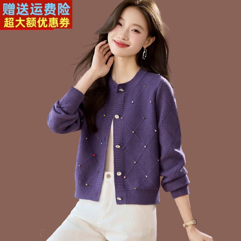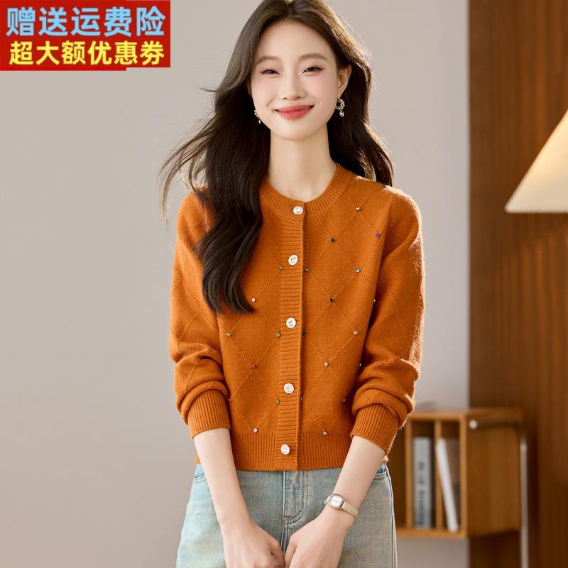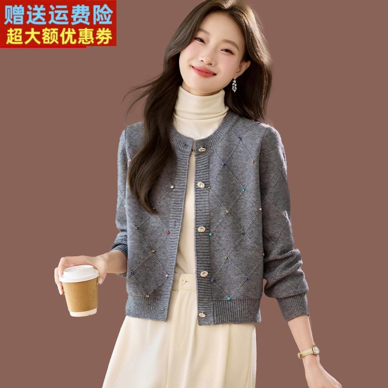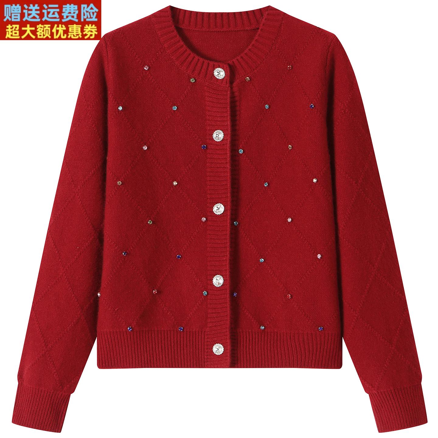 羊毛针织开衫女秋季短款钉珠圆领红色上衣配裙子外搭小款毛衣外套