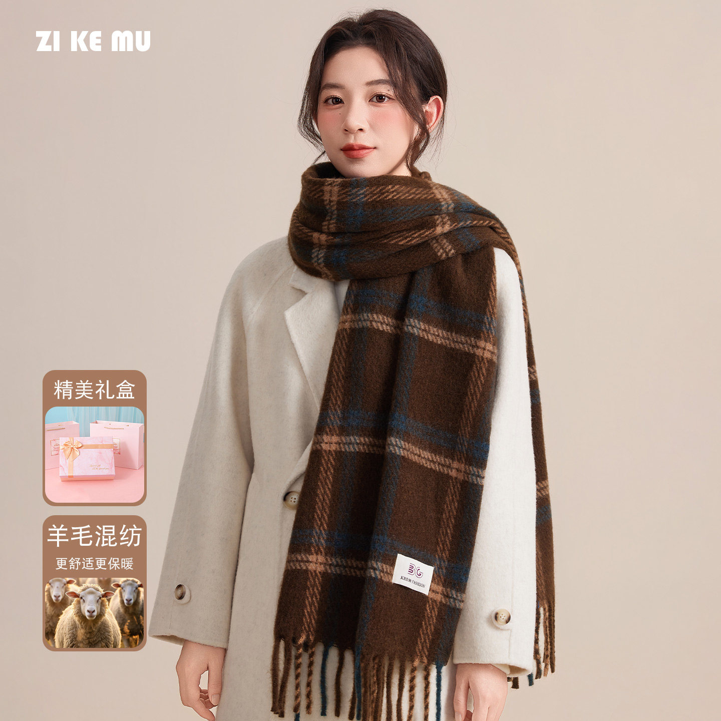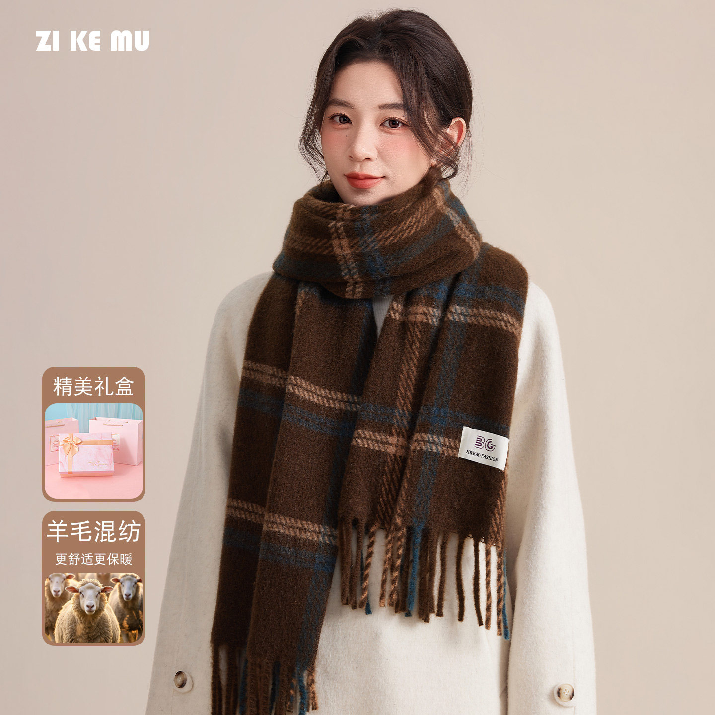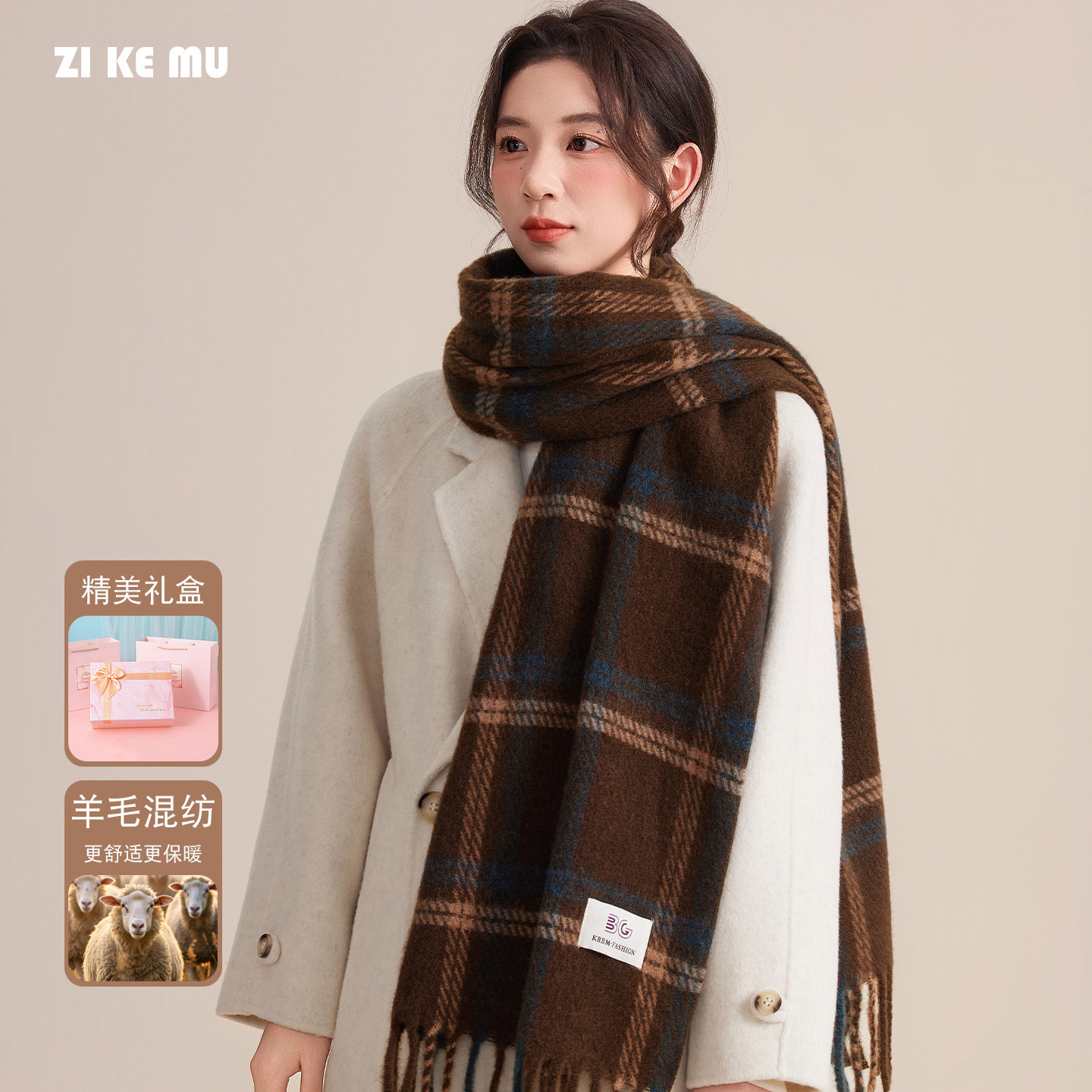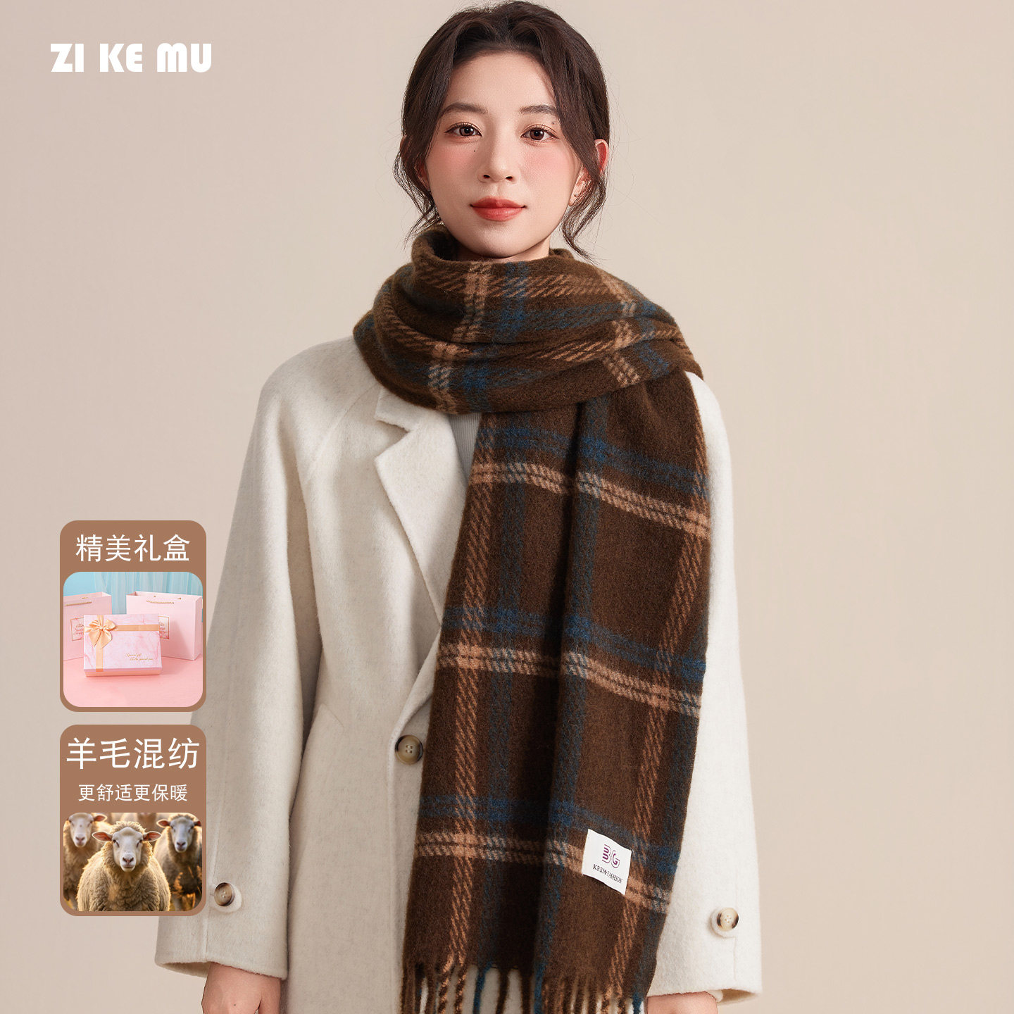 复古格子围巾女冬季加厚保暖女士优雅英伦风高级感羊毛混披肩围脖