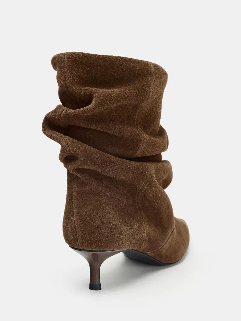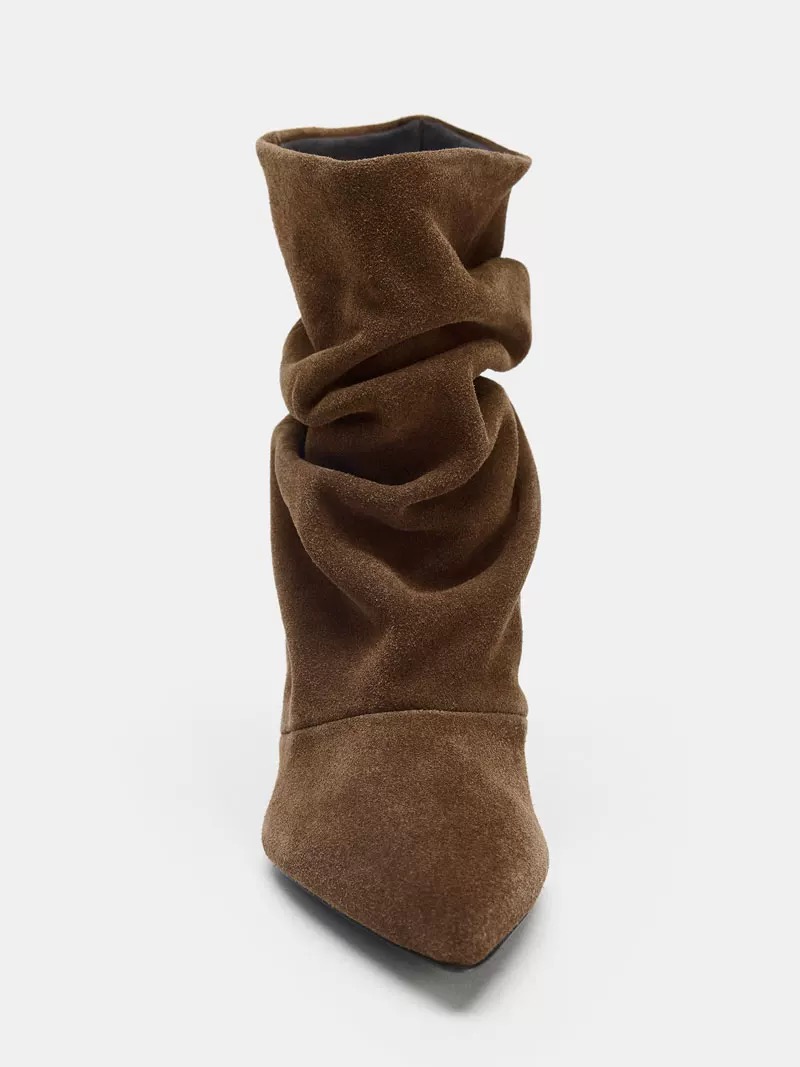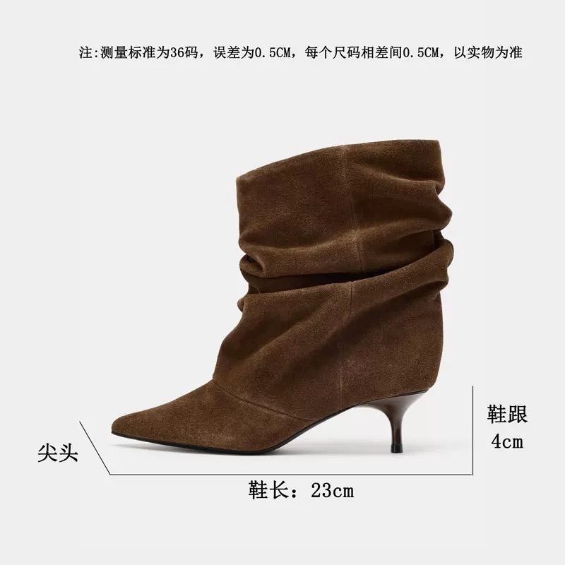 ZA细跟尖头弹力瘦瘦靴女绒面时装褶皱堆堆靴中筒法式复古短靴