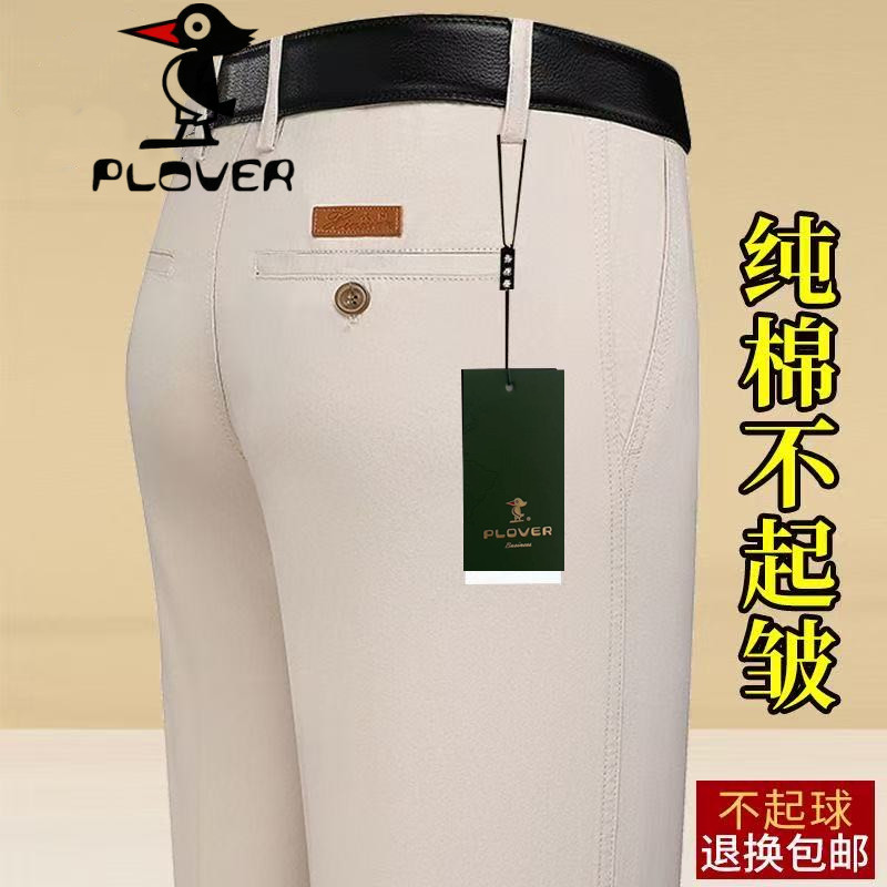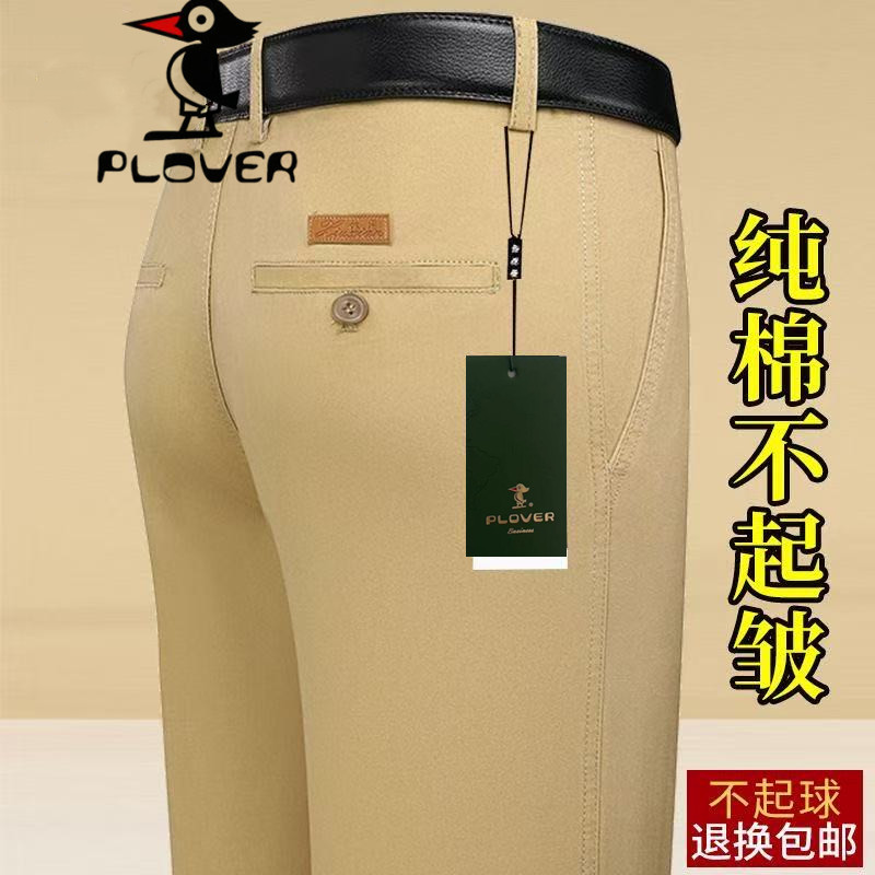 啄木鸟集团夏季100%纯棉休闲裤男士高腰直筒商务免烫爸爸薄棉长裤
