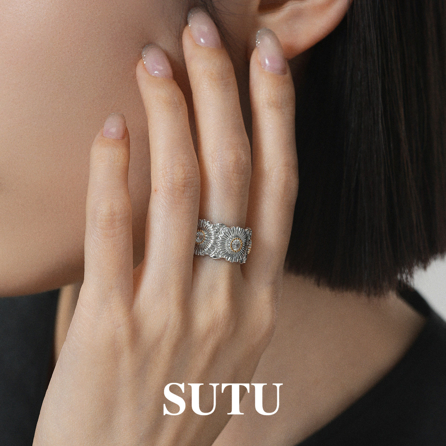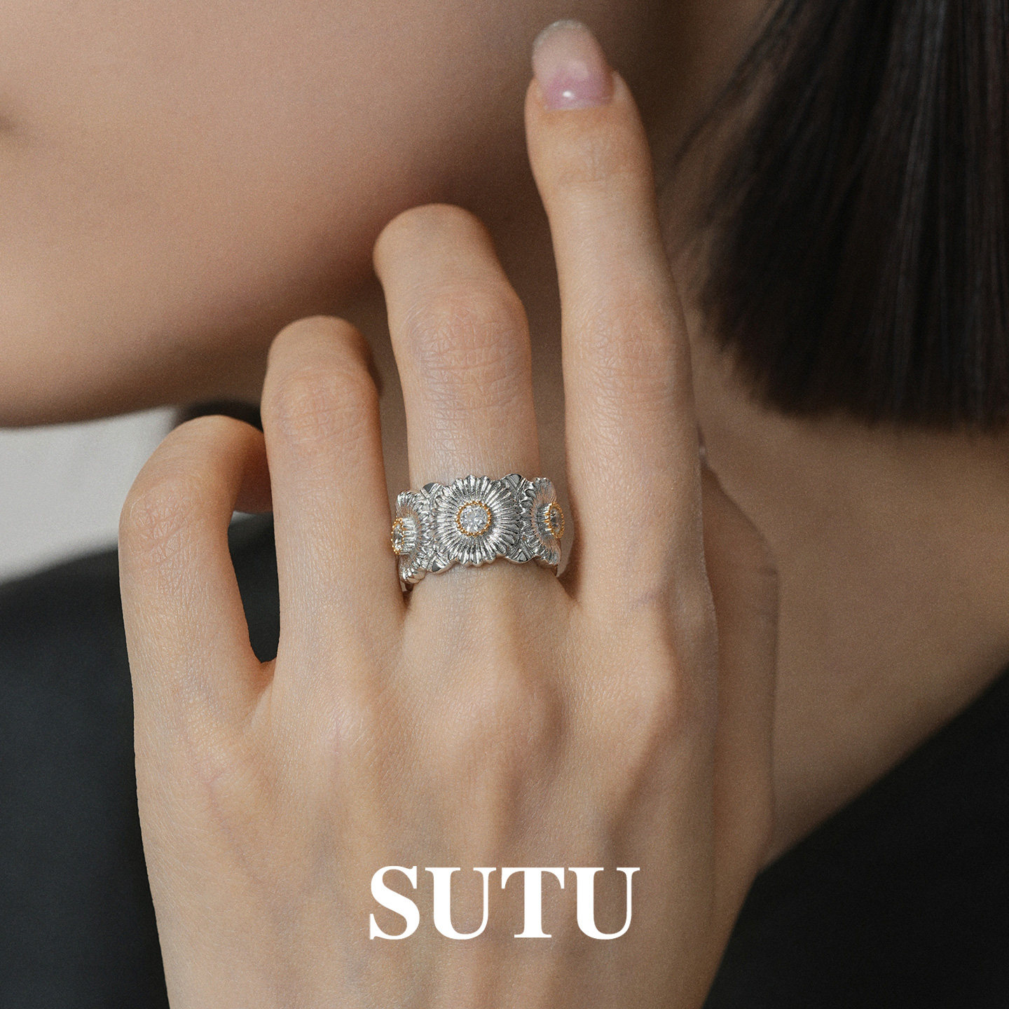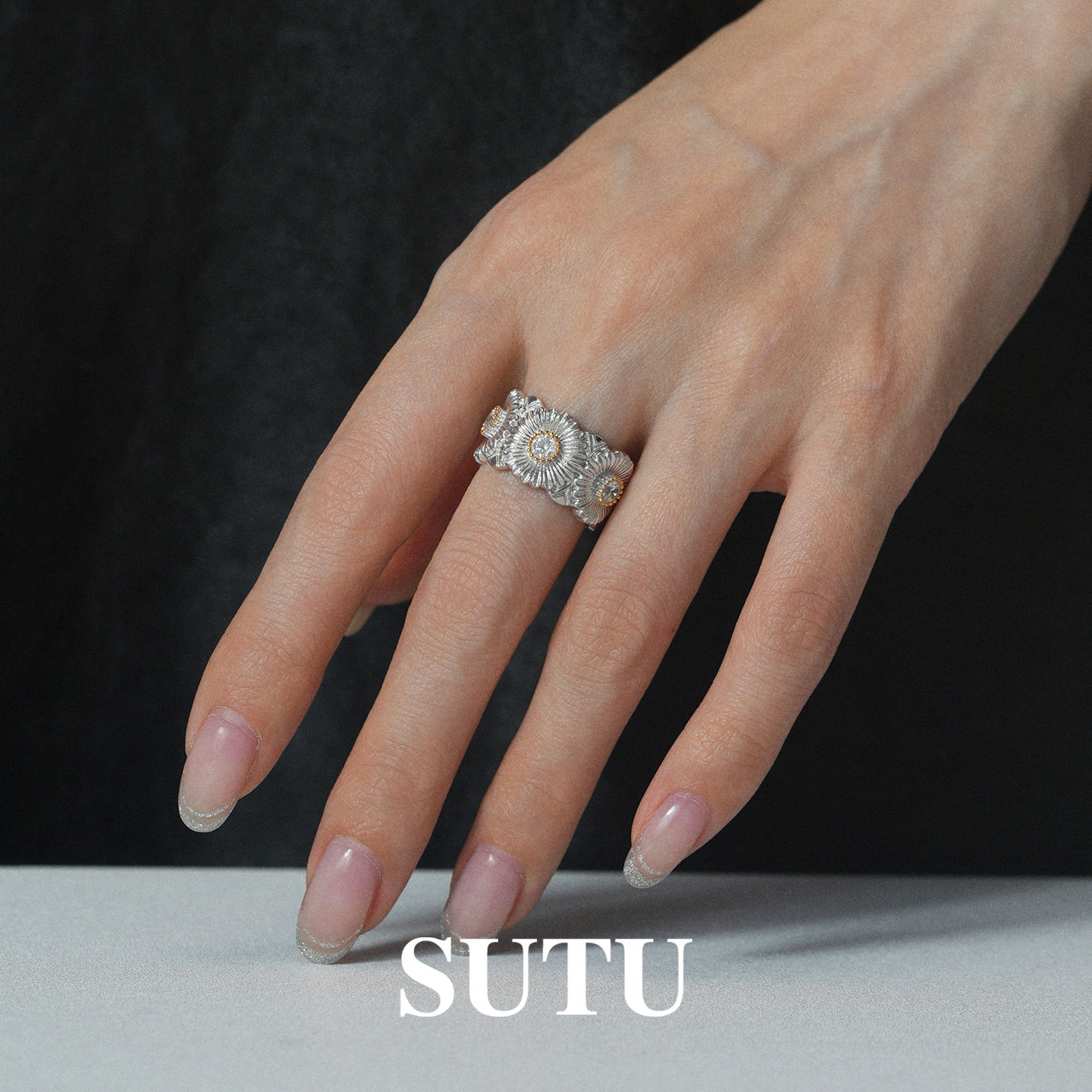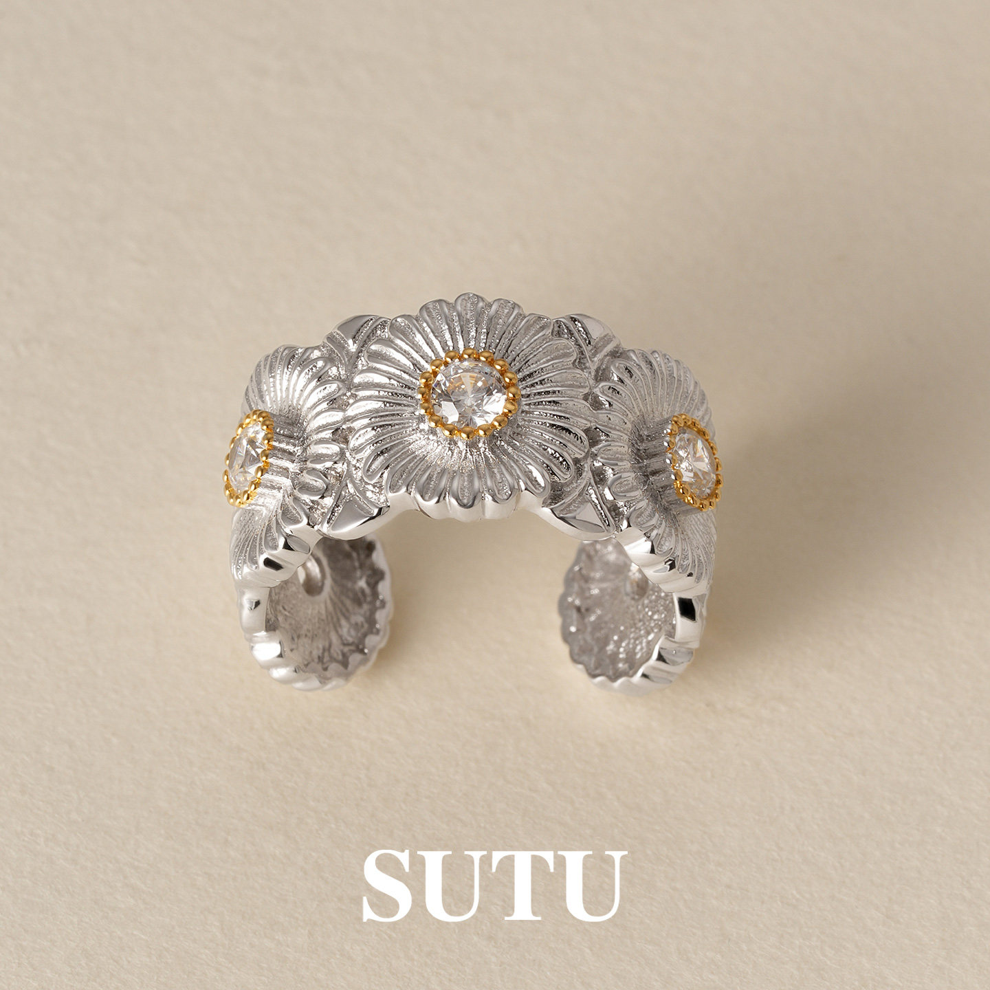 素图雏菊戒指925银精致小众设计开口戒食指戒指复古轻奢高级指环