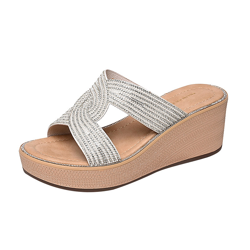 百丽纯爱2025新款女鞋拖鞋女夏时尚外穿钻带厚底高跟坡跟凉拖鞋