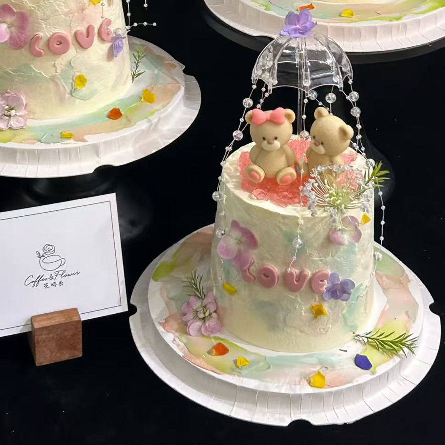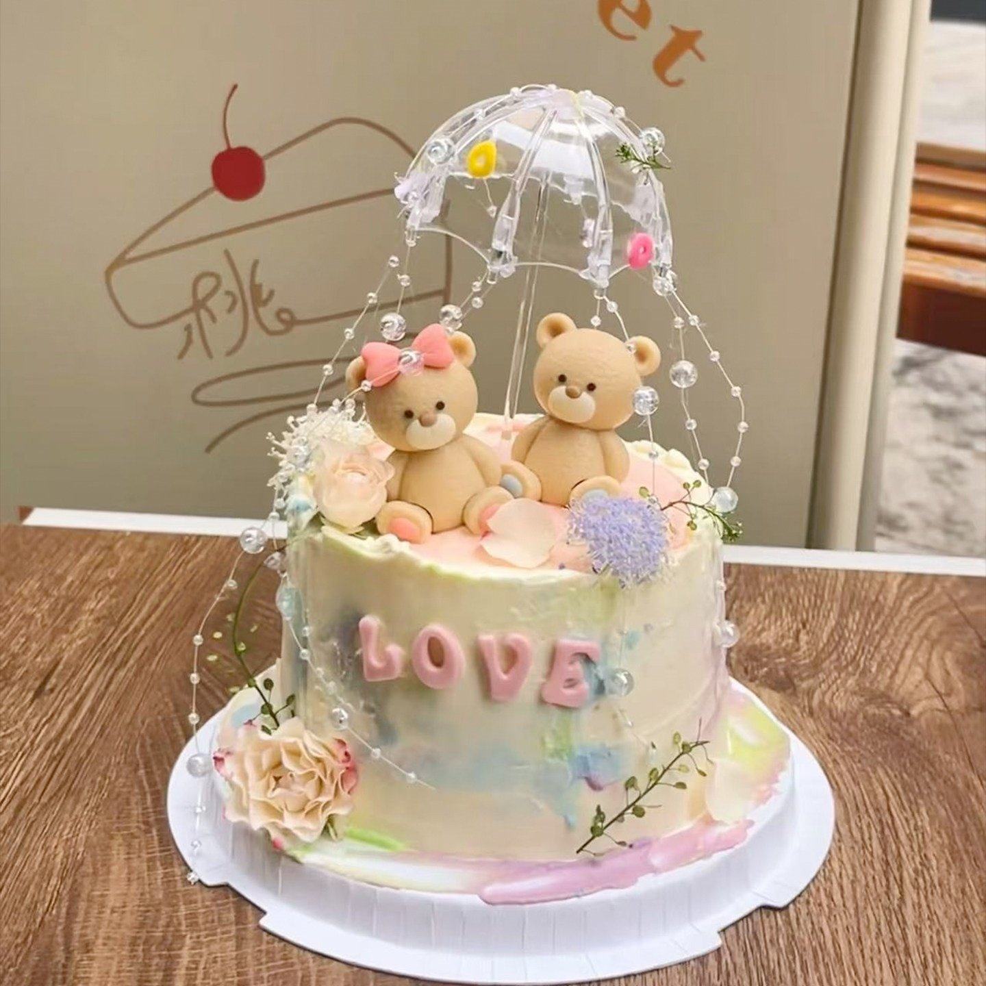 2.14情人节坐姿小熊蛋糕装饰摆件透明小雨伞情侣表白节日烘焙装扮