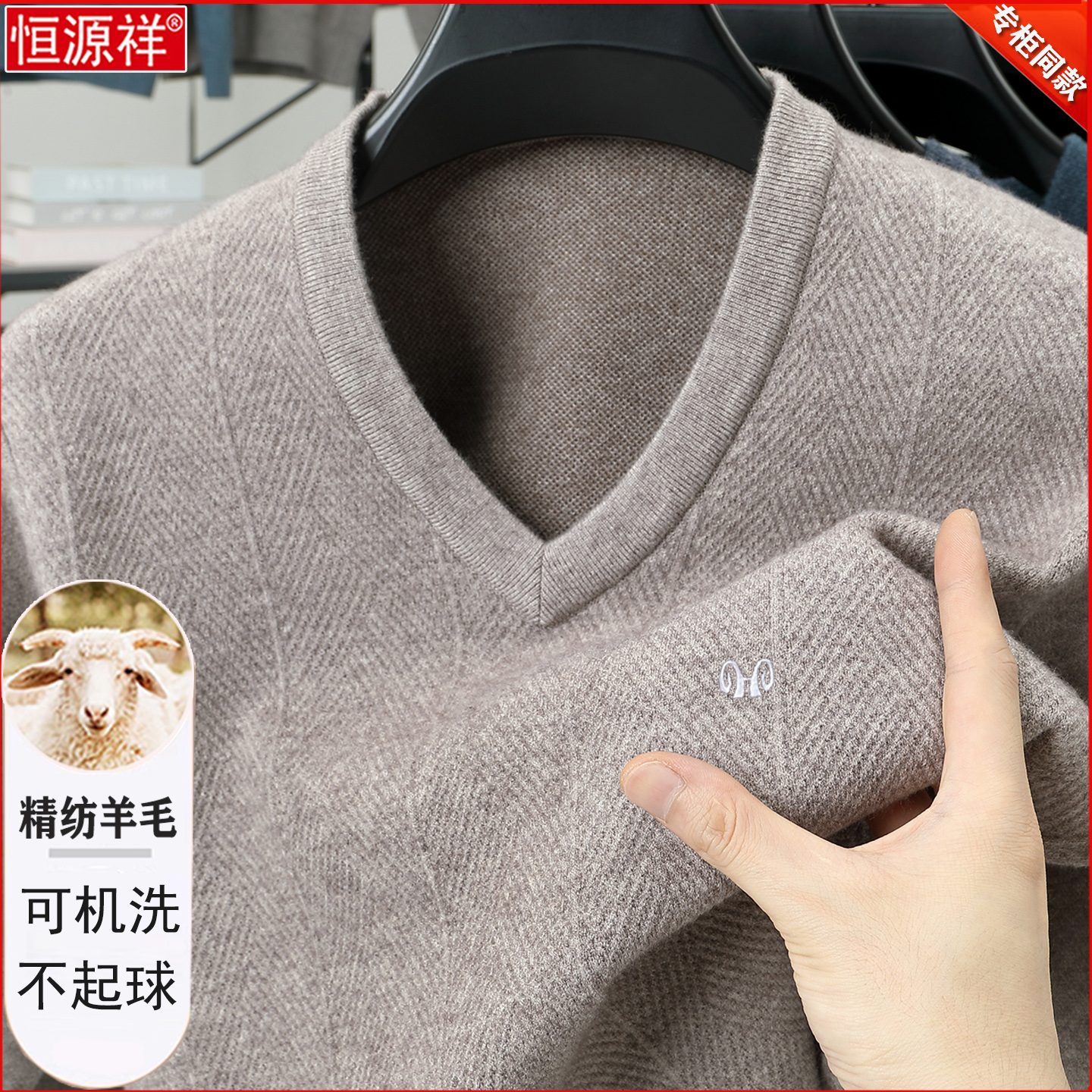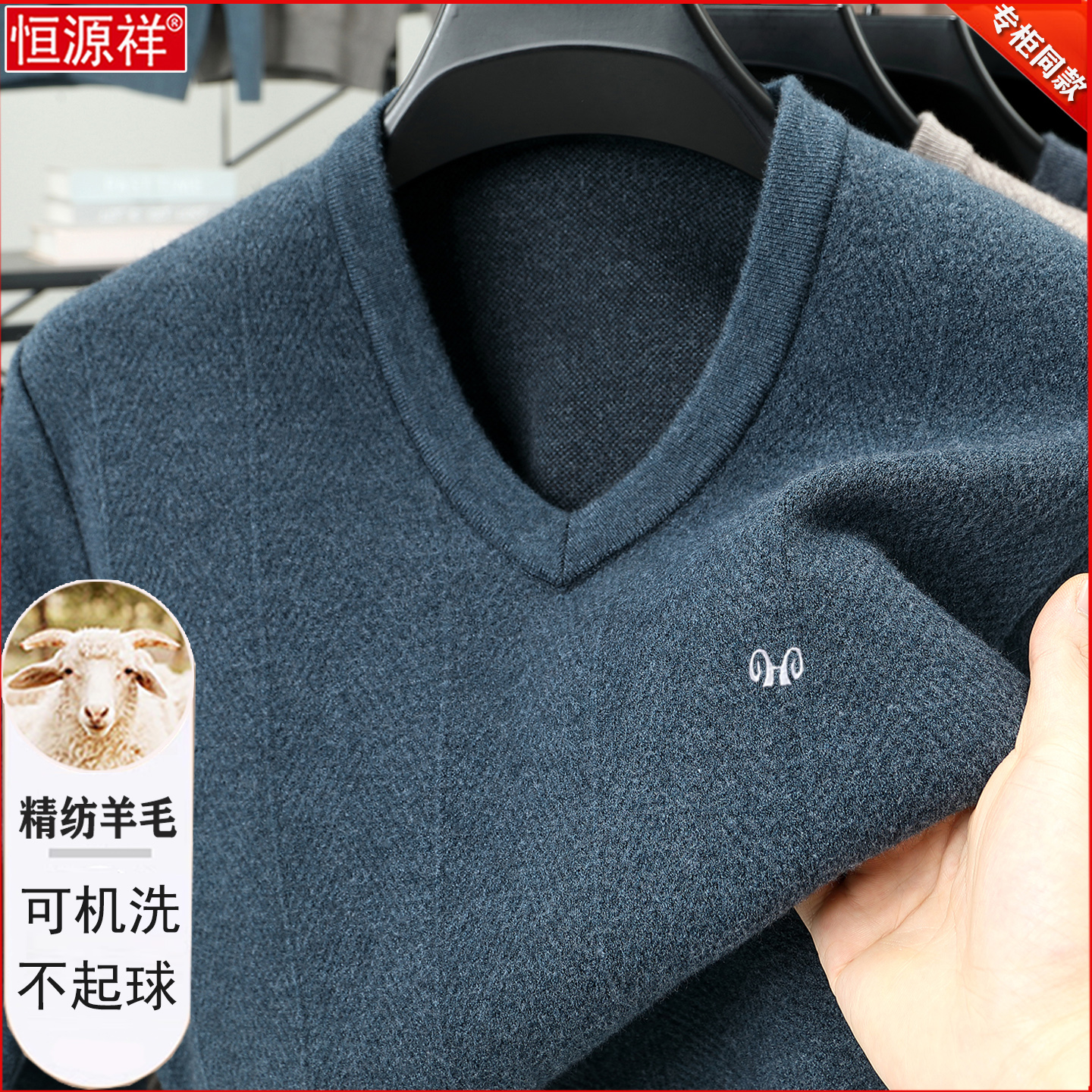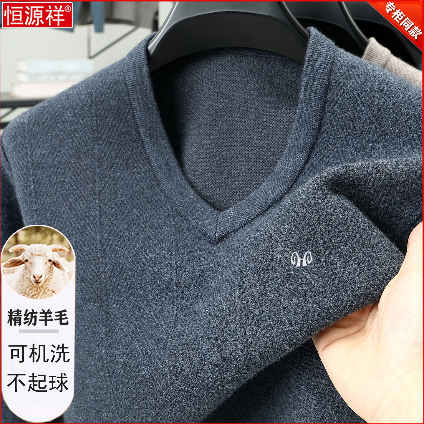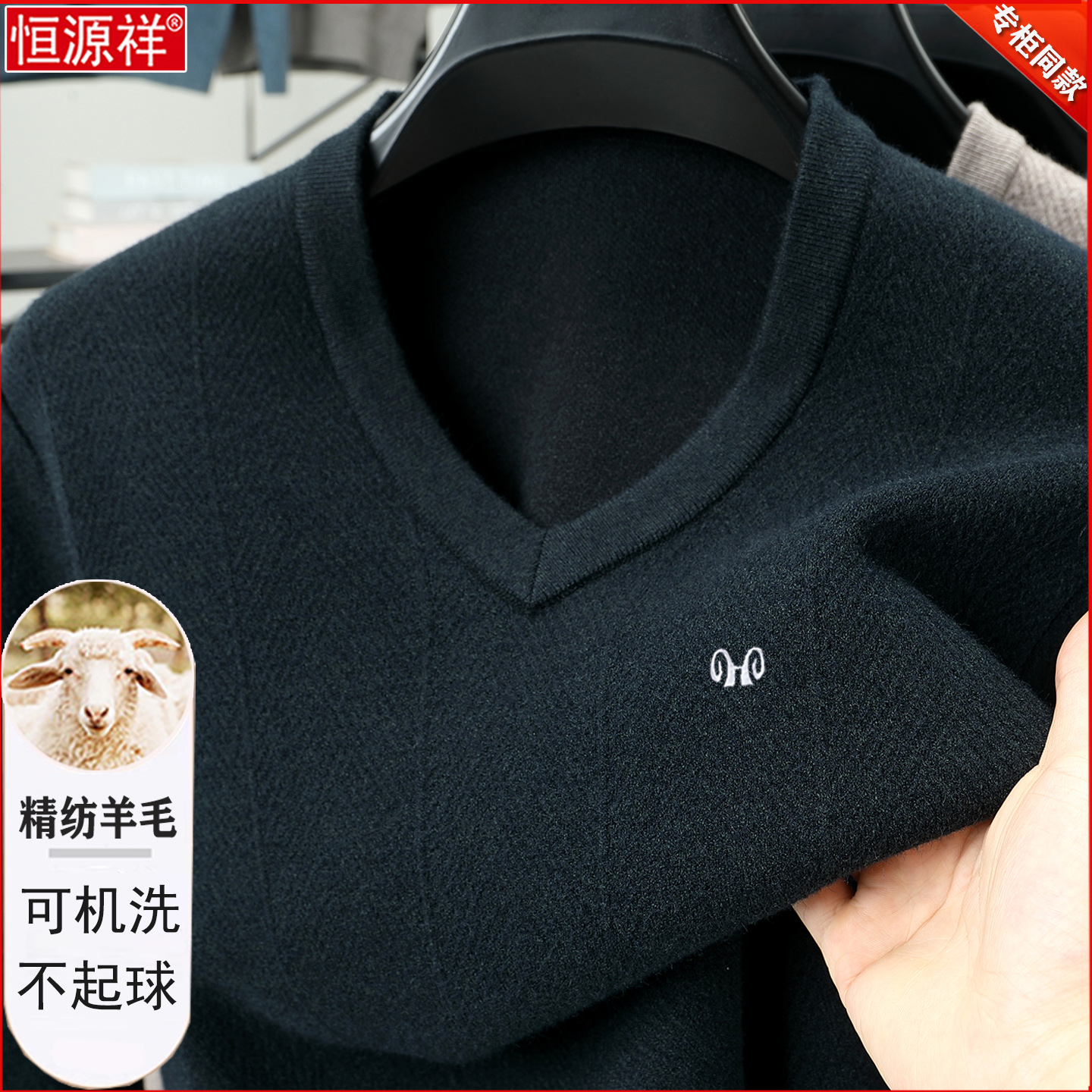 恒源祥羊毛衫男士冬款加厚保暖V领爸爸毛衣中老年鸡心领羊绒打底