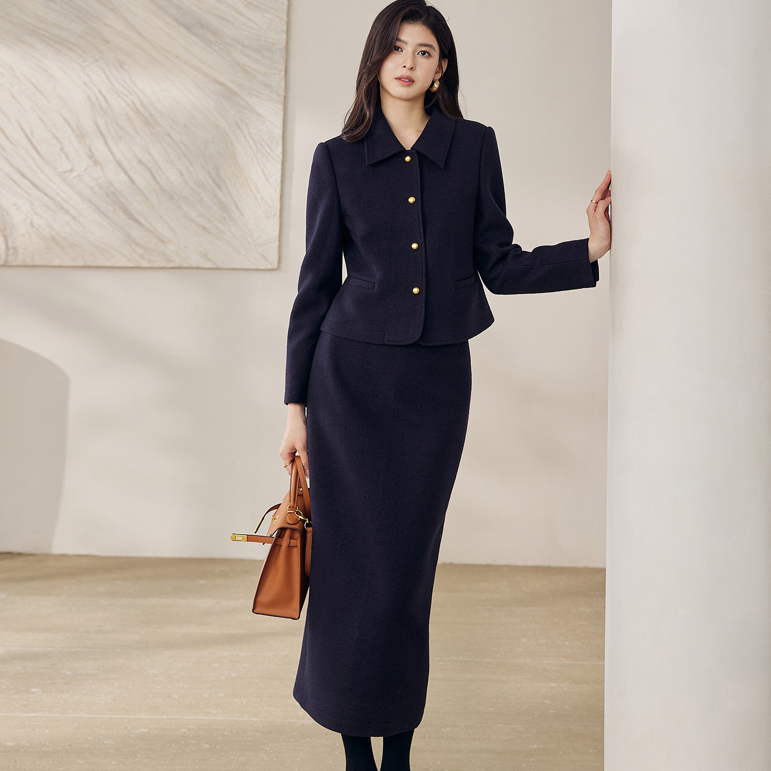 罗衣高级深蓝色毛呢套装女秋冬通勤短西装外套半身裙两件套13069