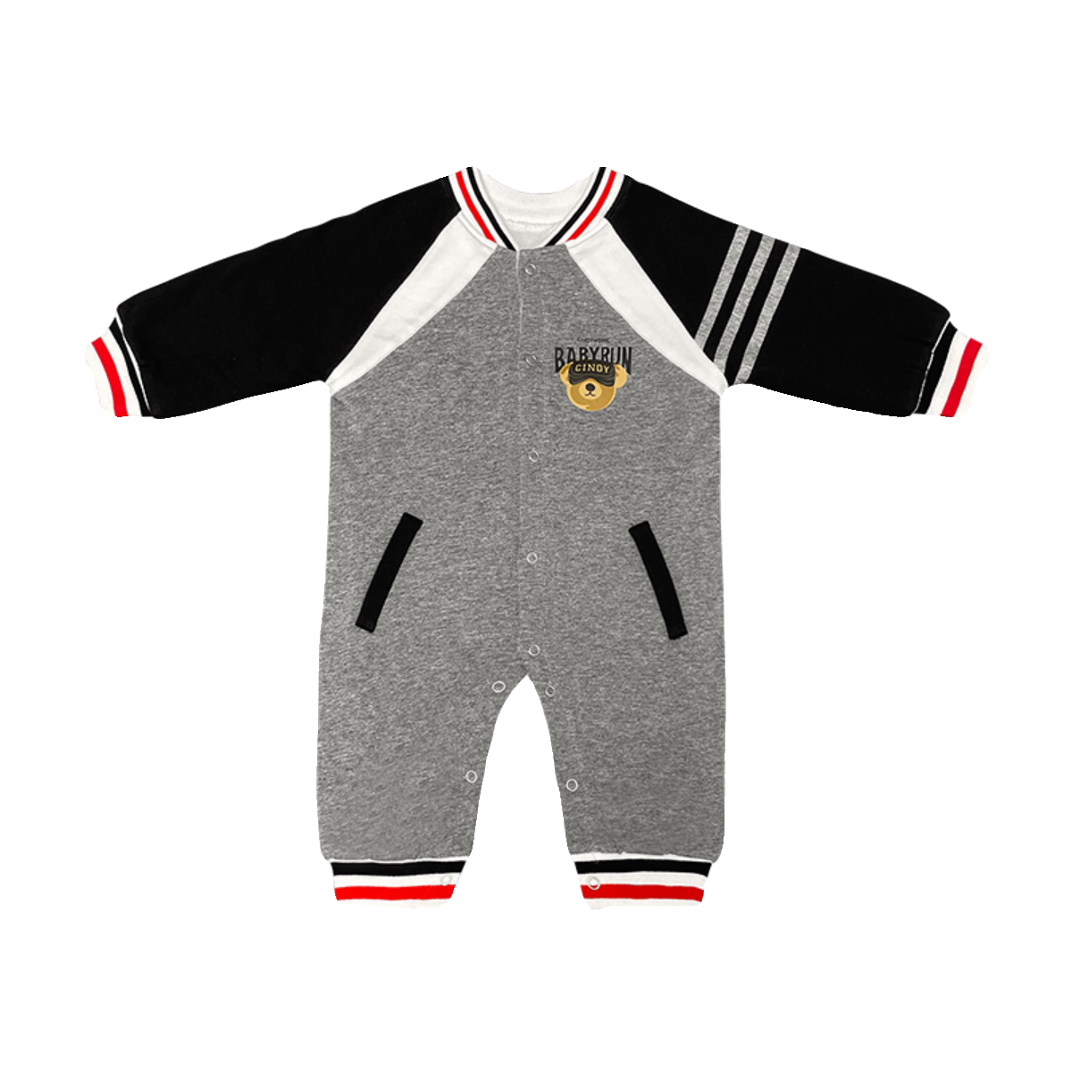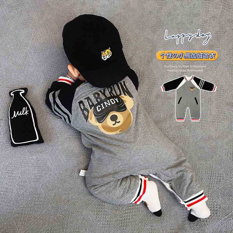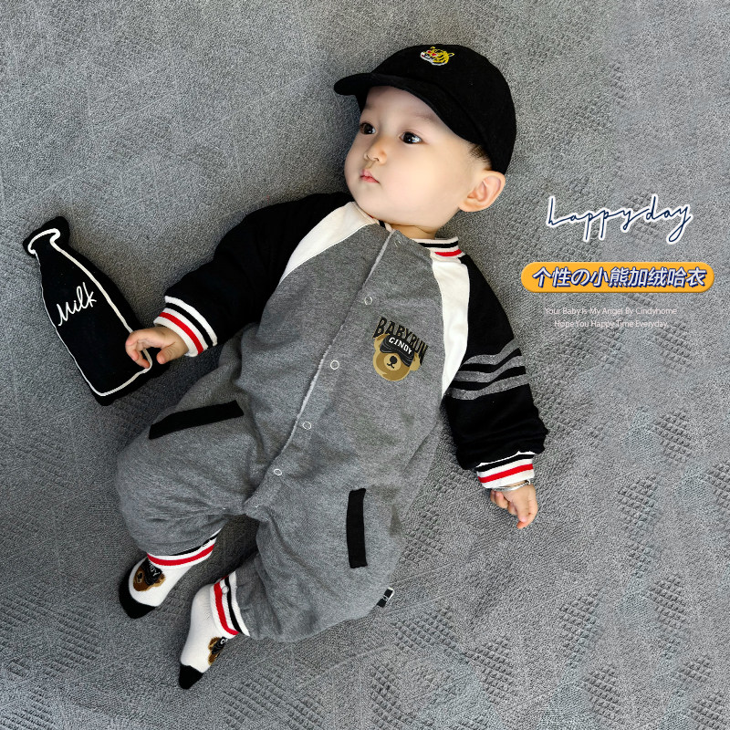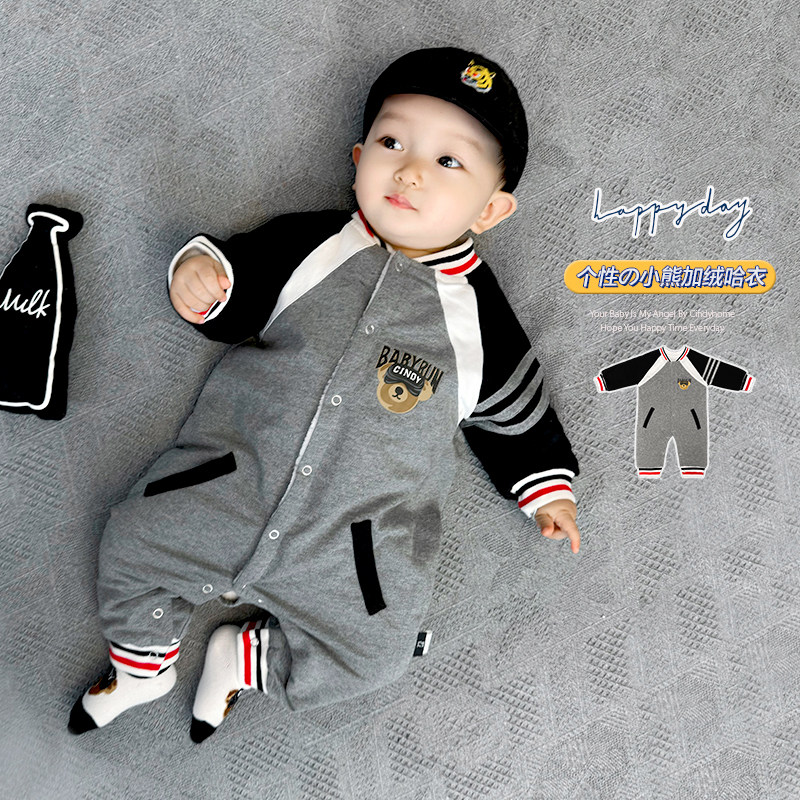 卡通熊新生婴儿连体衣秋冬季纯棉双层加绒冬天冬装厚款男宝宝衣服