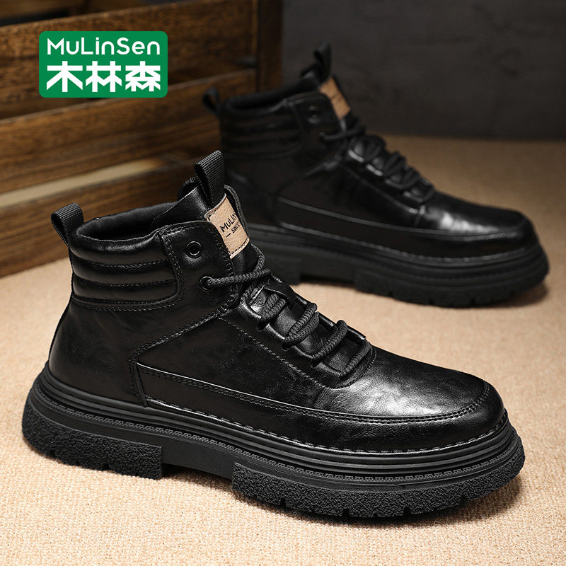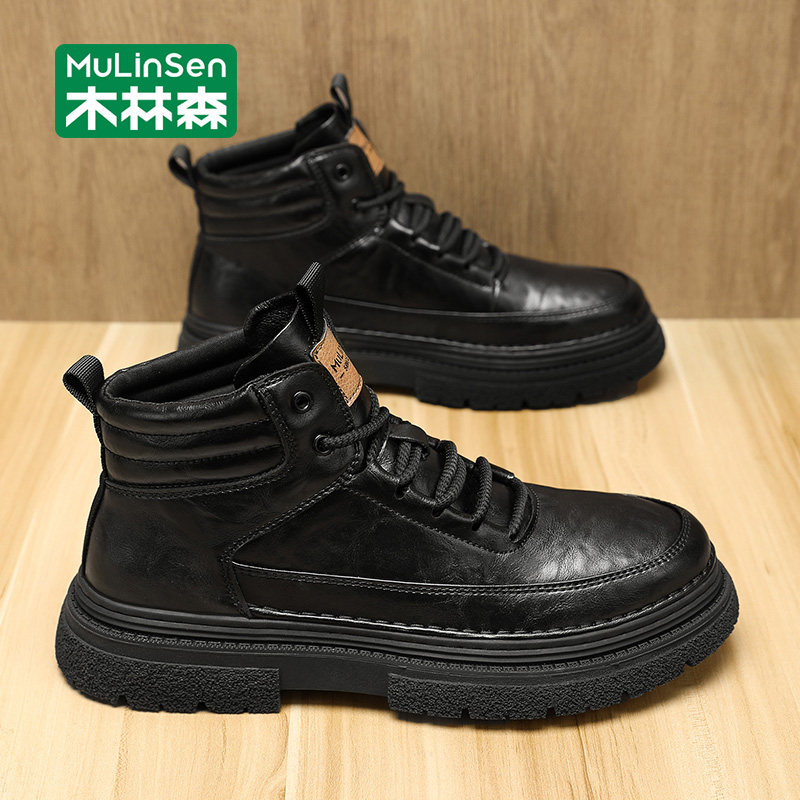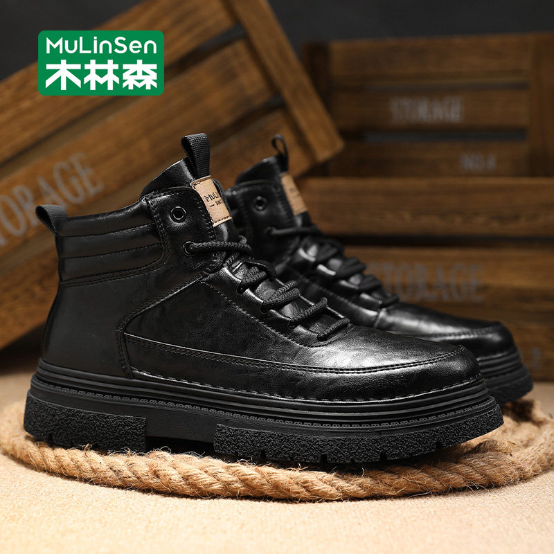 木林森马丁靴男款黑色英伦风休闲工装男靴中帮秋冬季机车休闲皮靴