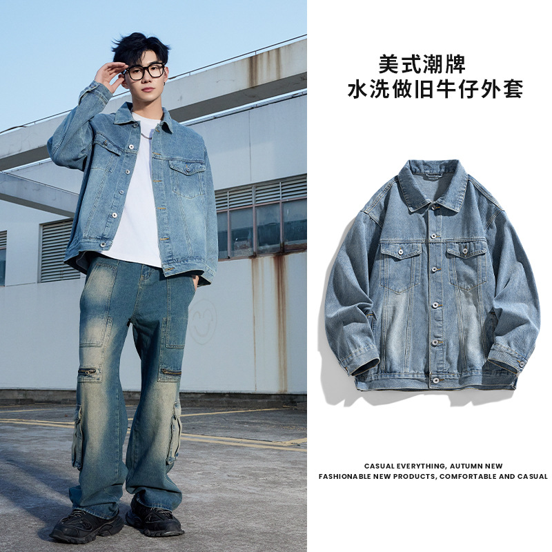 春秋季新款牛仔外套男怀旧韩版宽松潮牌复古牛仔夹克情侣同款上衣