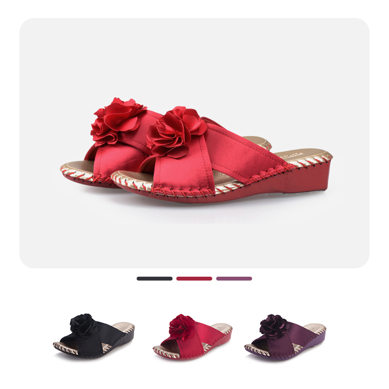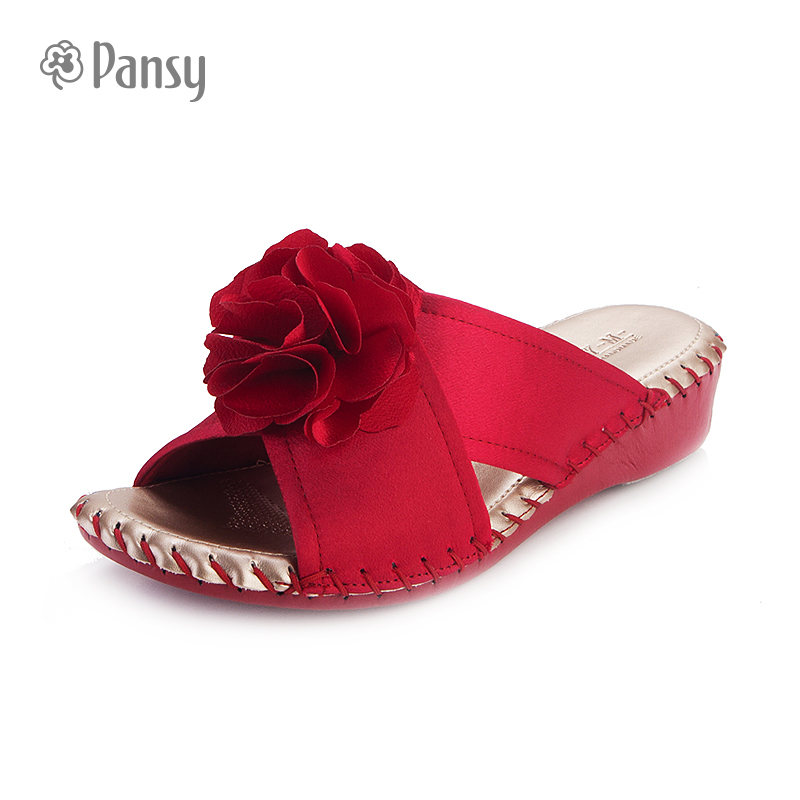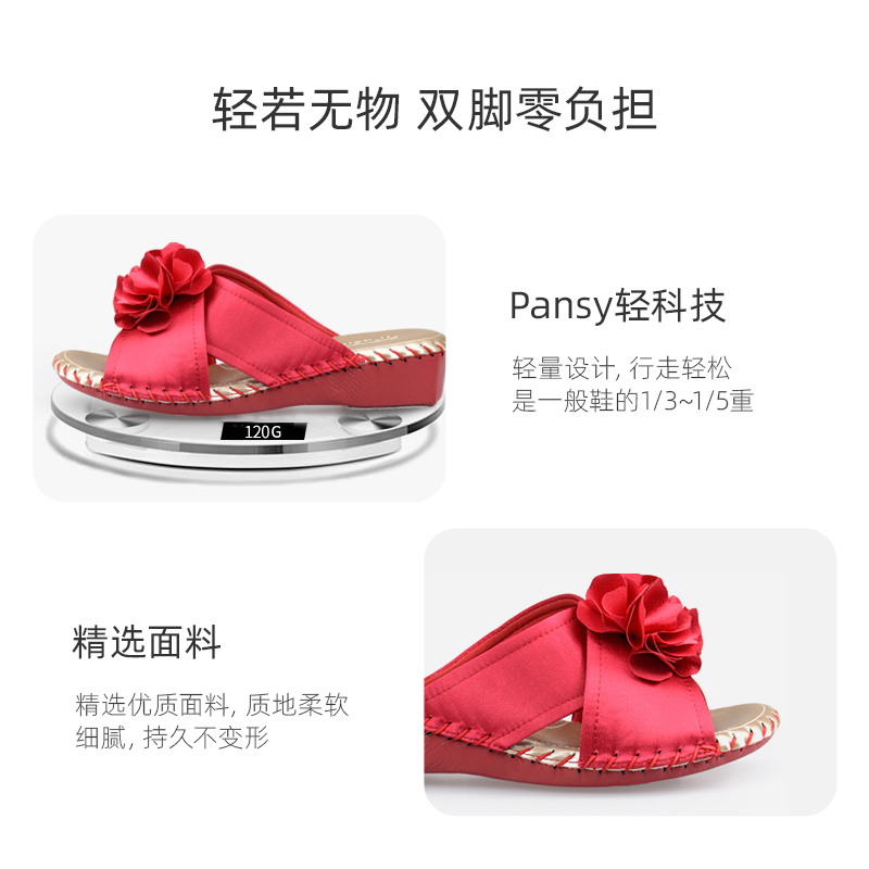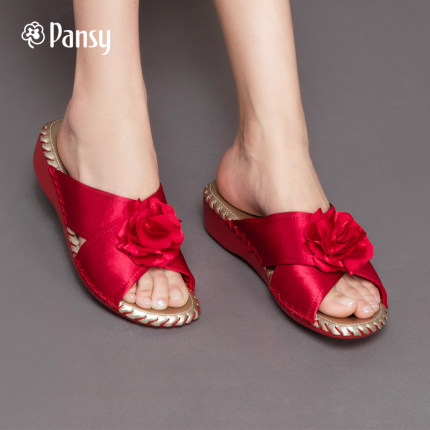 Pansy日本春秋女居家用红花朵结婚礼防滑地板室内坡跟凉拖9舒适鞋