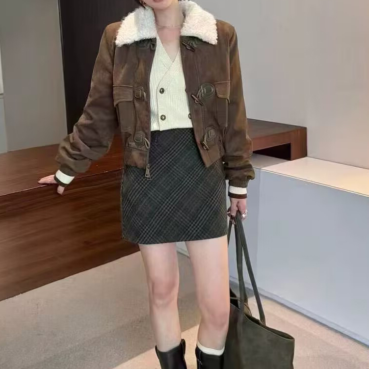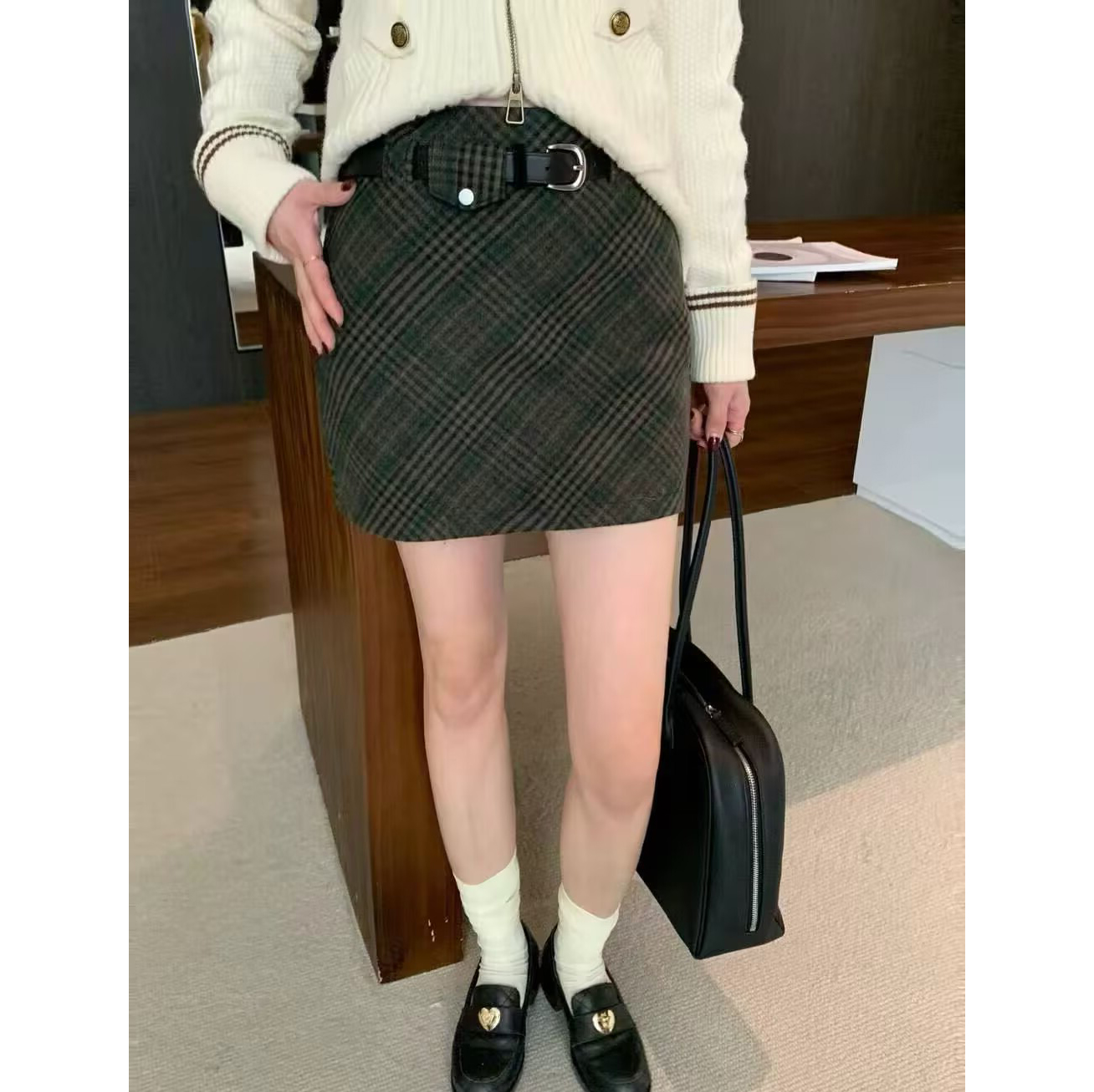 2025复古格子显瘦高腰毛呢半身裙女秋冬季a字包臀短裙子