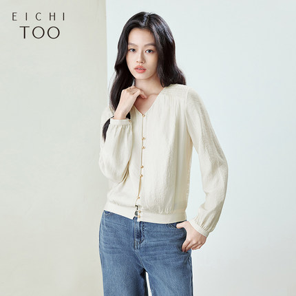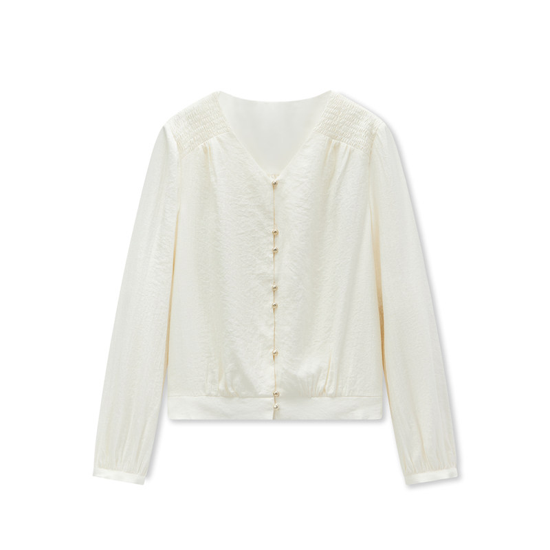 爱居兔复古V领褶皱肌理感长袖衬衫女2025年春季新款宽松浅色上衣