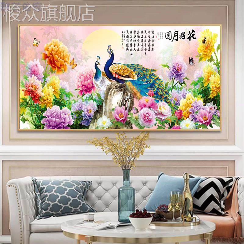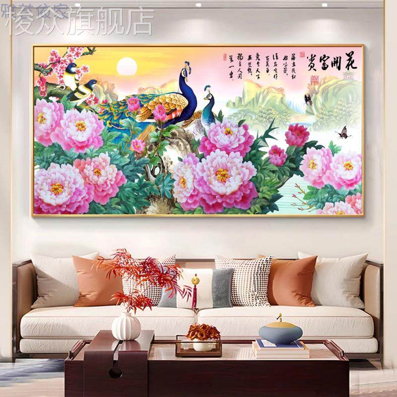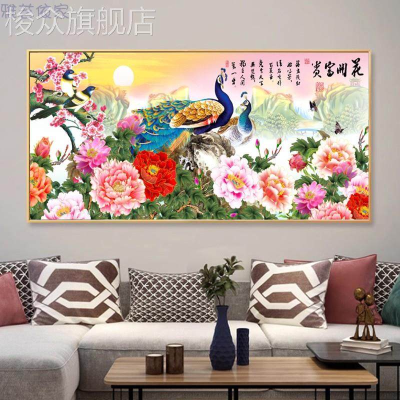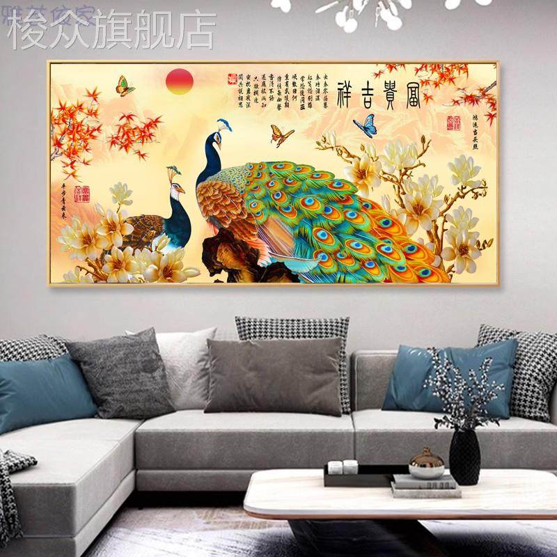 客厅装饰画简欧欧式沙发背景墙壁画餐厅墙面横幅挂画大气中式孔雀