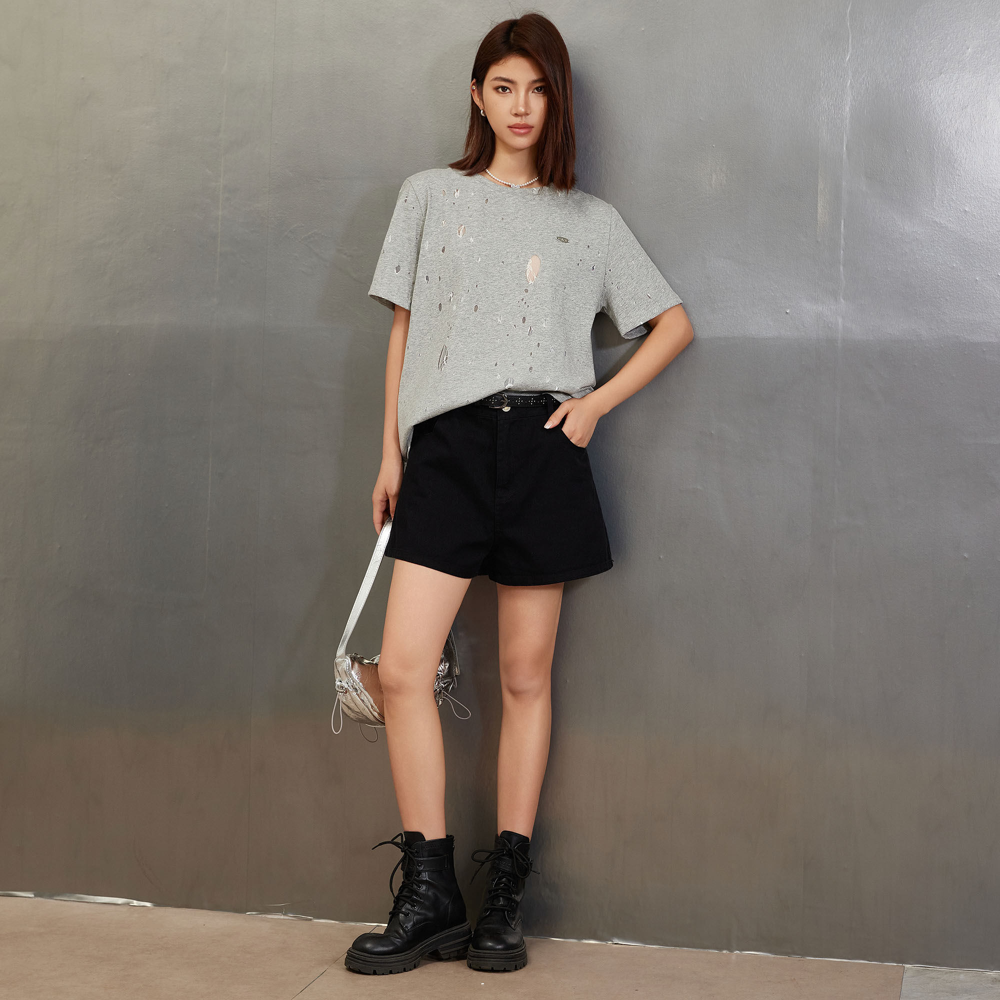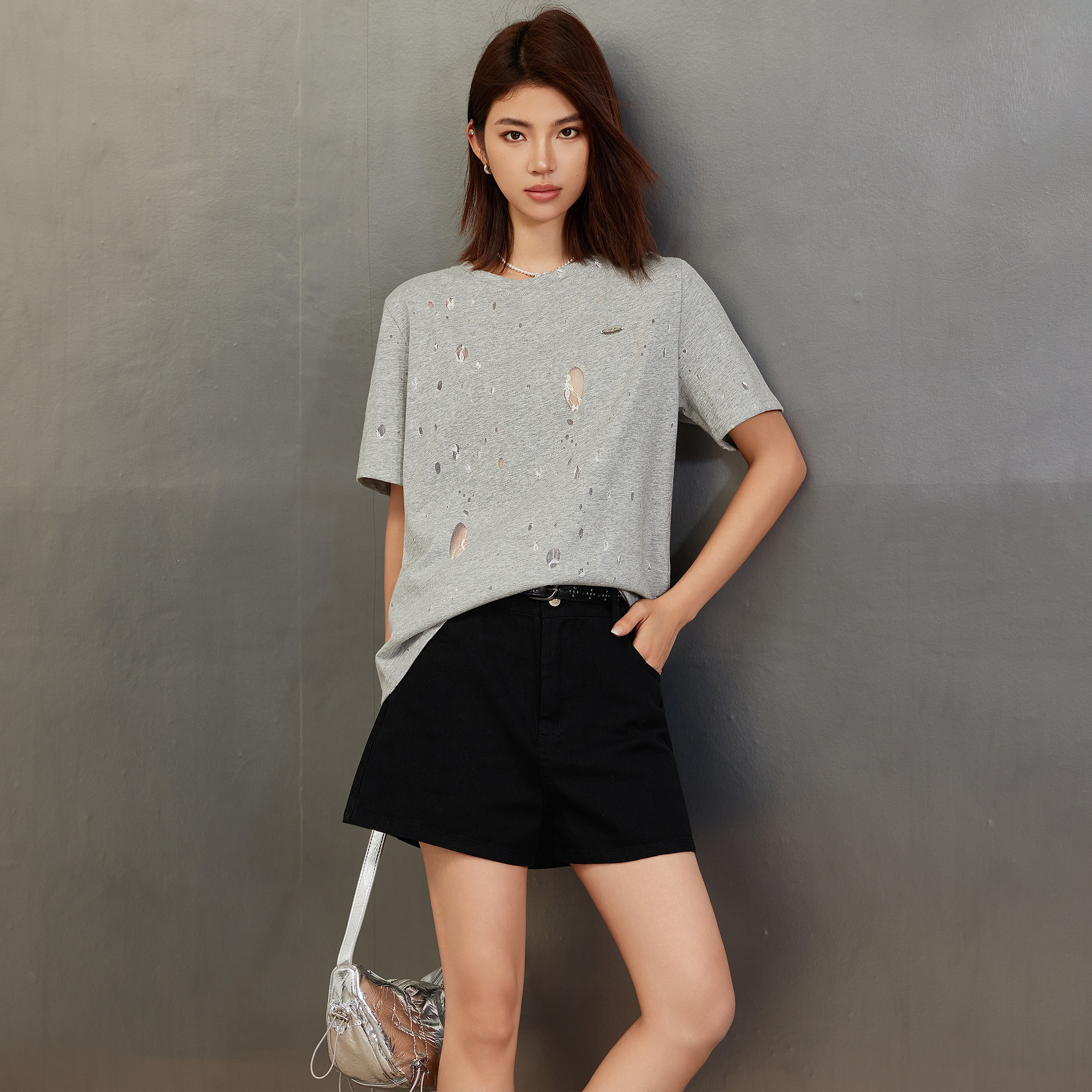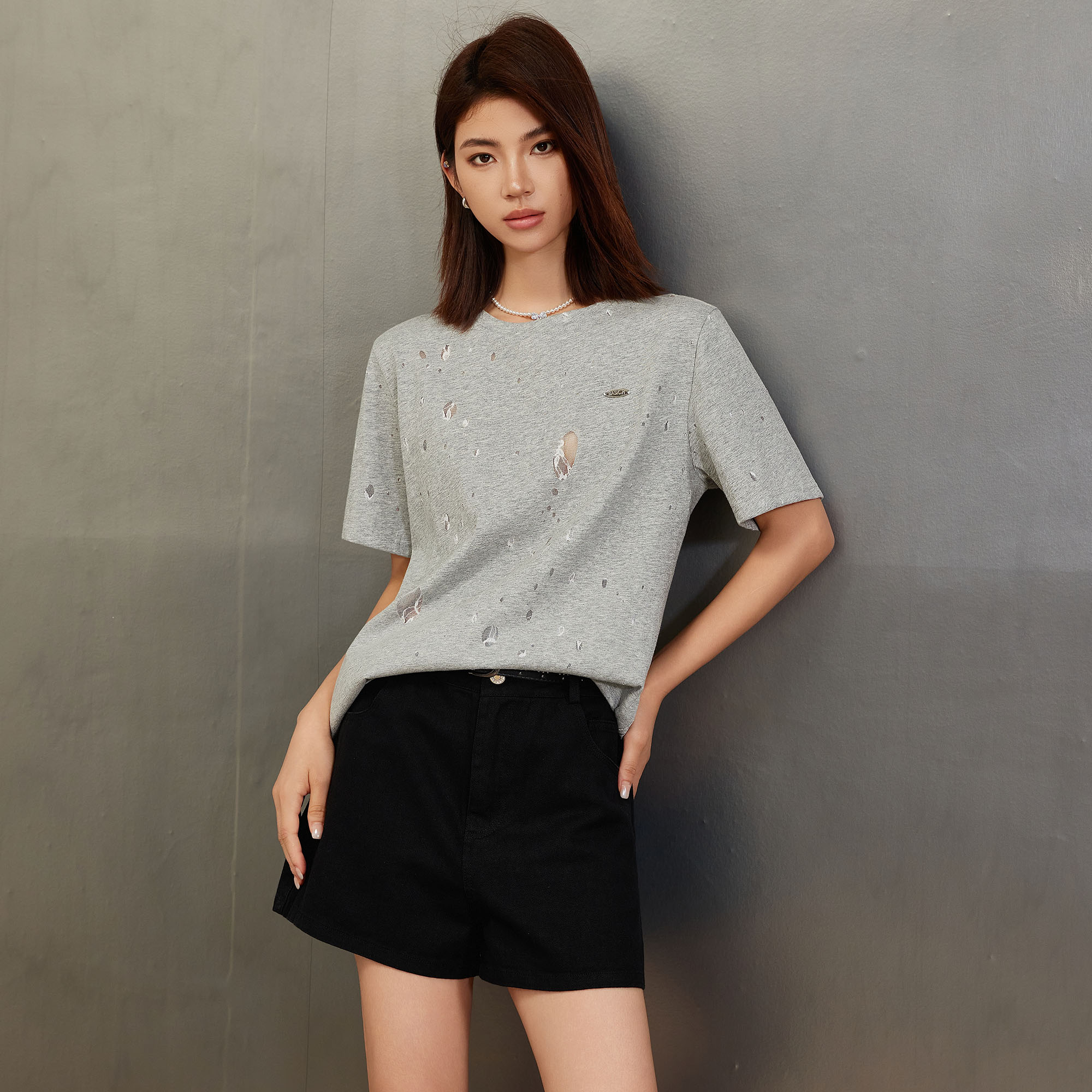Basic House/百家好美式拼接蕾丝破洞短袖T恤女2025夏季显瘦上衣