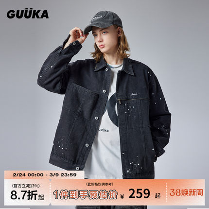GUUKA废土风泼墨黑色牛仔外套男春秋季新款 美式复古翻领夹克宽松