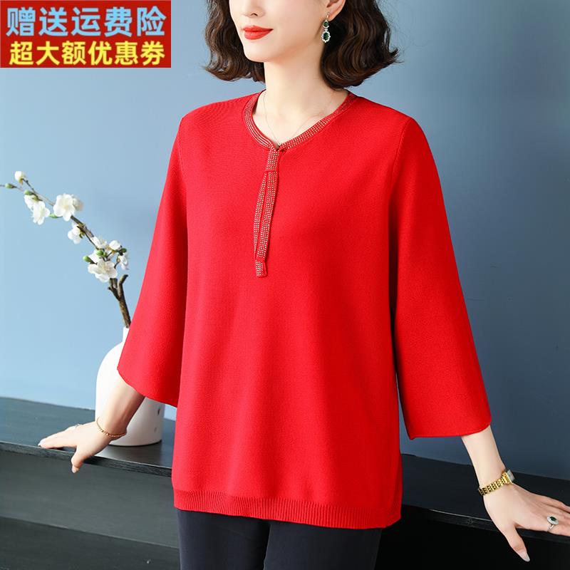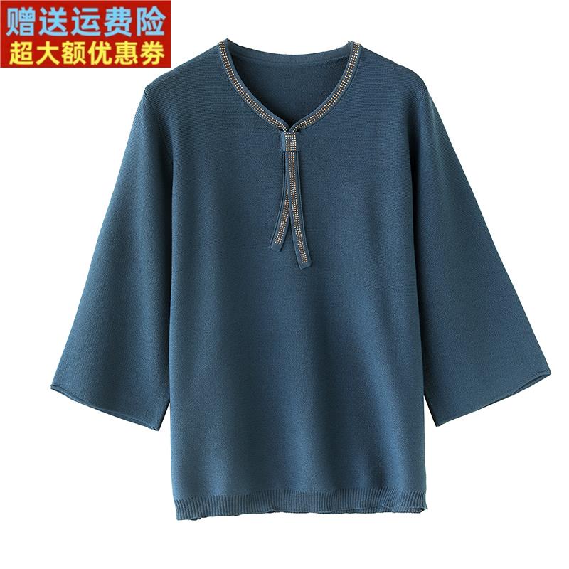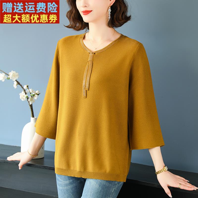 中年妈妈春夏新款七分袖针织衫洋气宽松薄上衣女加肥大码冰丝T恤