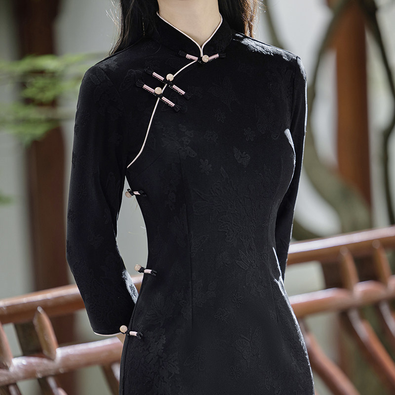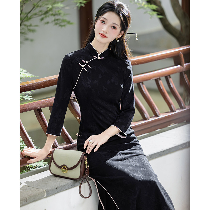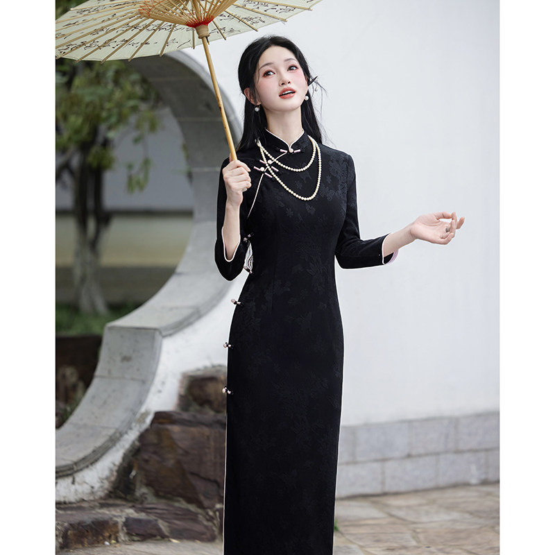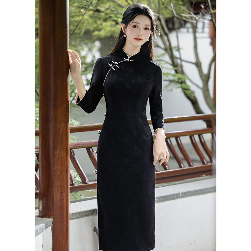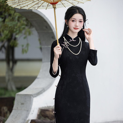 黑色优雅旗袍长款微胖遮肚显瘦高档高级感日常2026年新款长袖改良