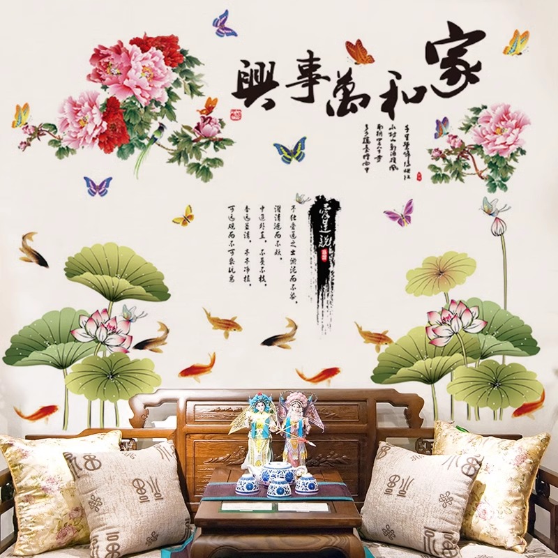 3D立体墙贴画荷花墙纸墙贴中国风客厅电视背景墙装饰竹子贴纸壁纸